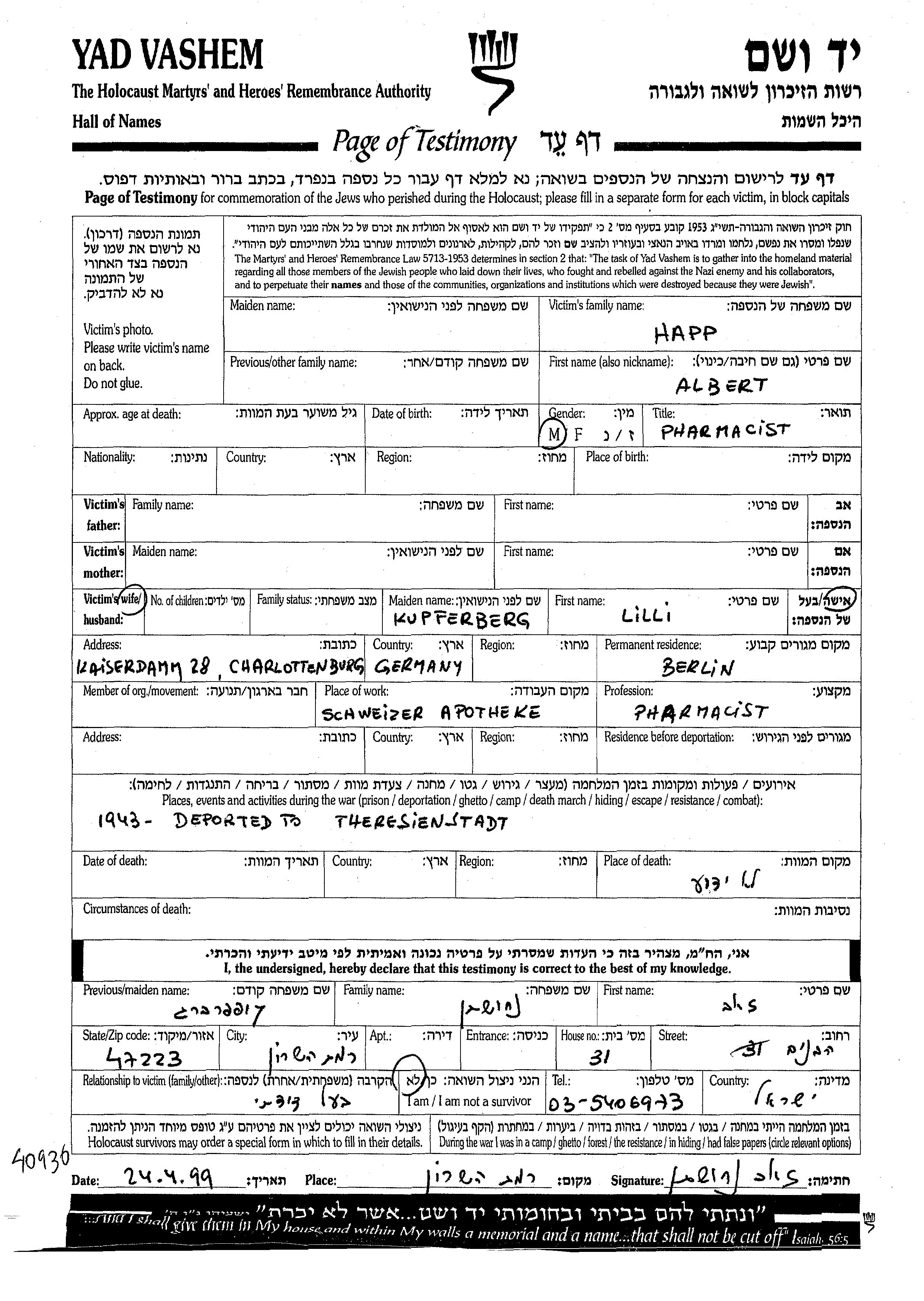 Хапп Альберт Берлин, Германия Лист свидетельских показаний