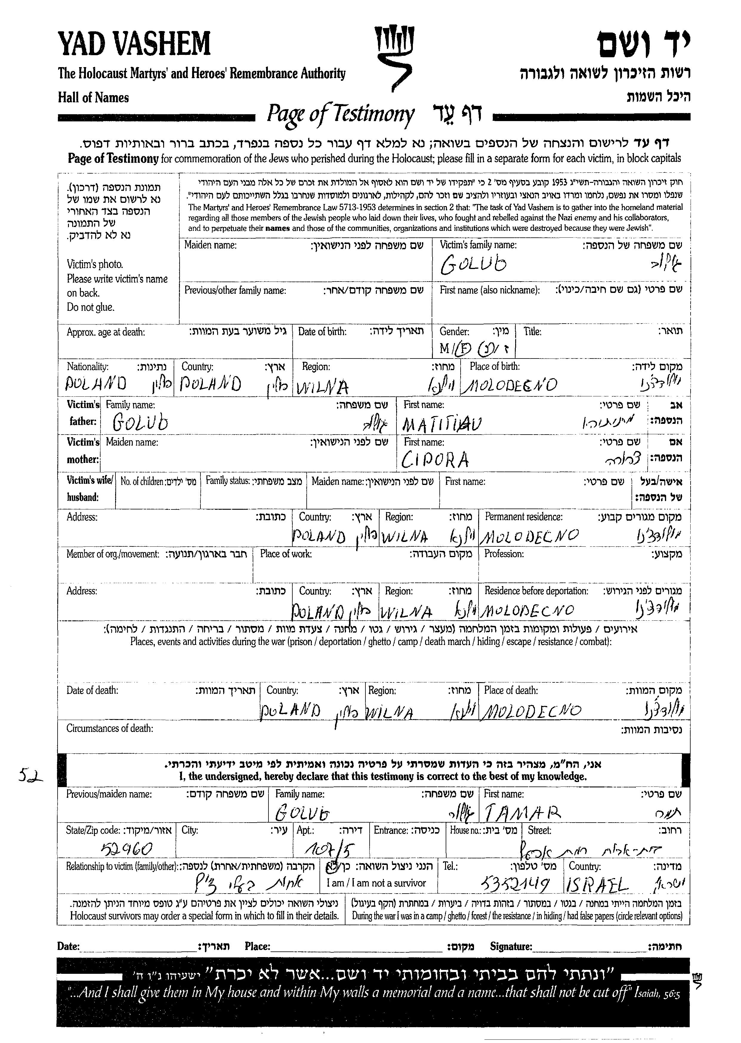 Имя неизвестно Голуб, место рождения: Молодечно, Польша. Отец: Матитьяу, mать:Ципора. Место жительства до войны: Молодечно, Польша. Место во время войны: Молодечно, Польша.