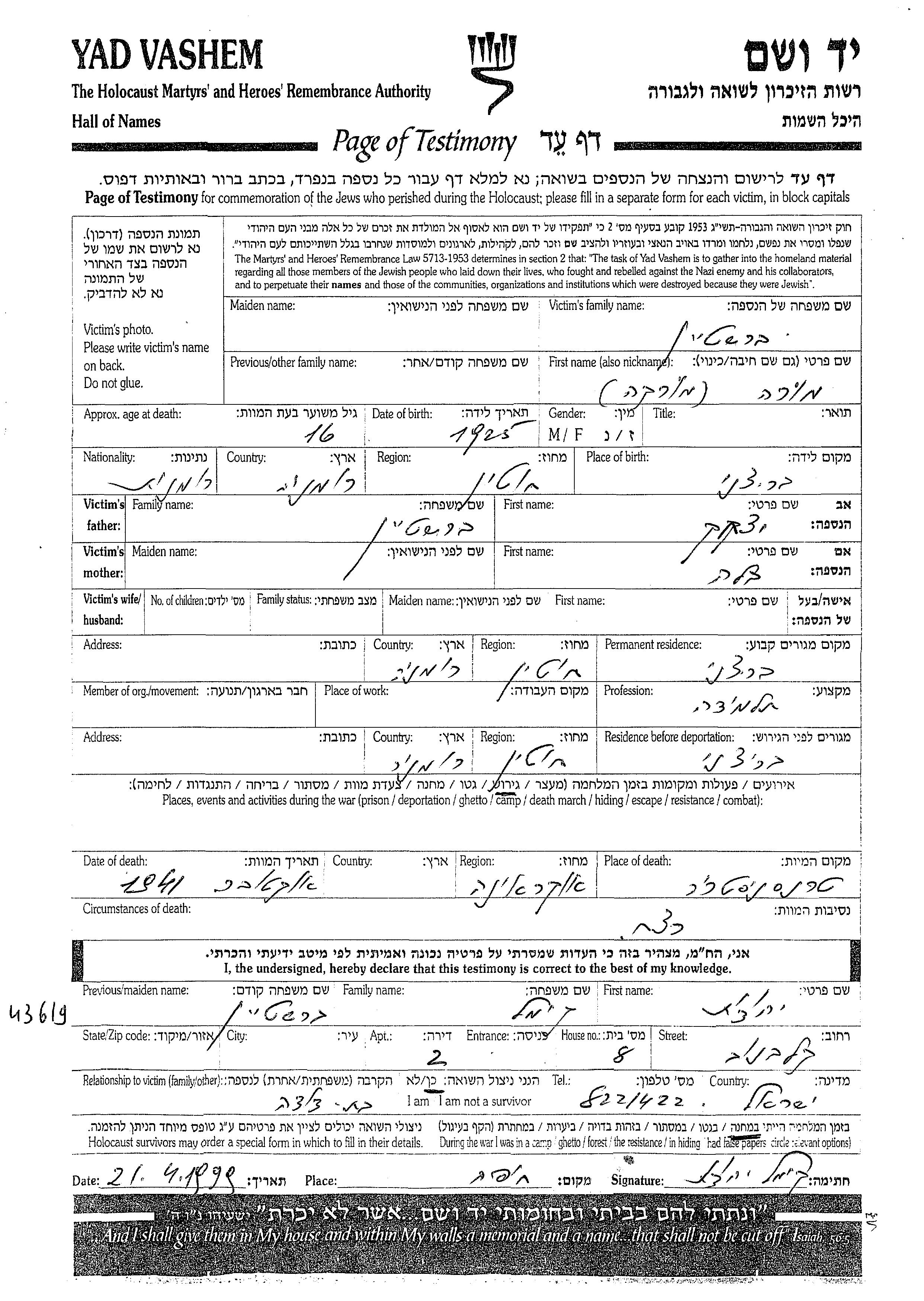 Яд Вашем - Листы свидетельских показаний Мемориального фонда