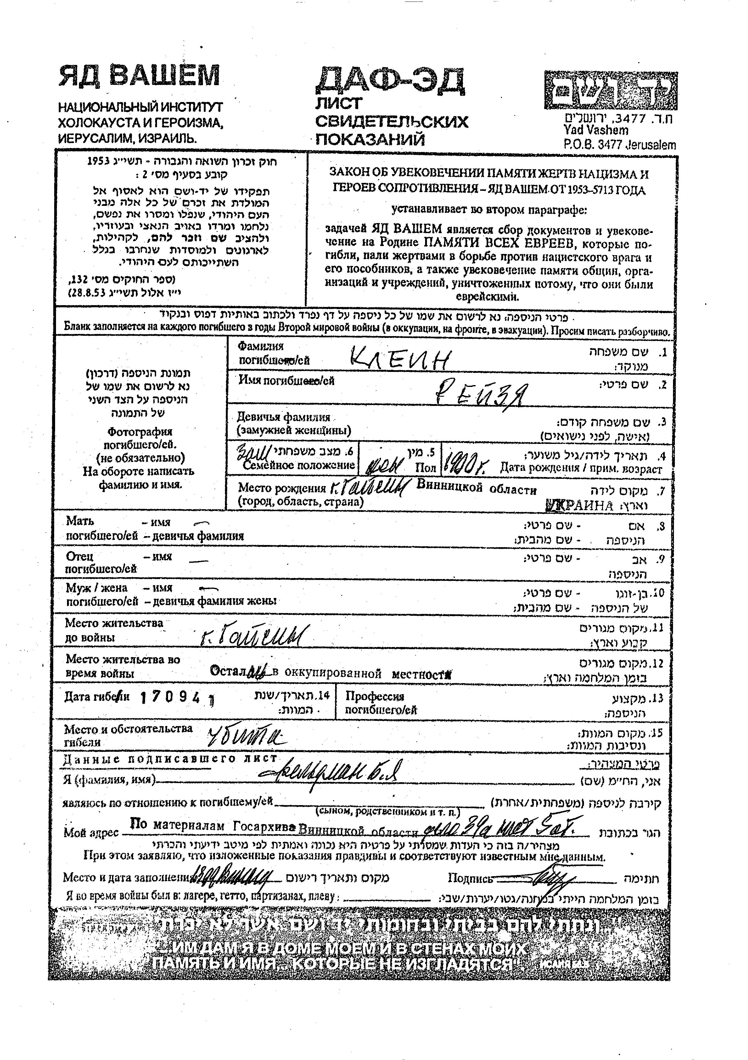 Рейзя Клейн, место рождения: Гайсин, Украина (СССР). Женат / замужем. Место жительства до войны: Гайсин, Украина (СССР). Место во время войны: Гайсин, Украина (СССР).