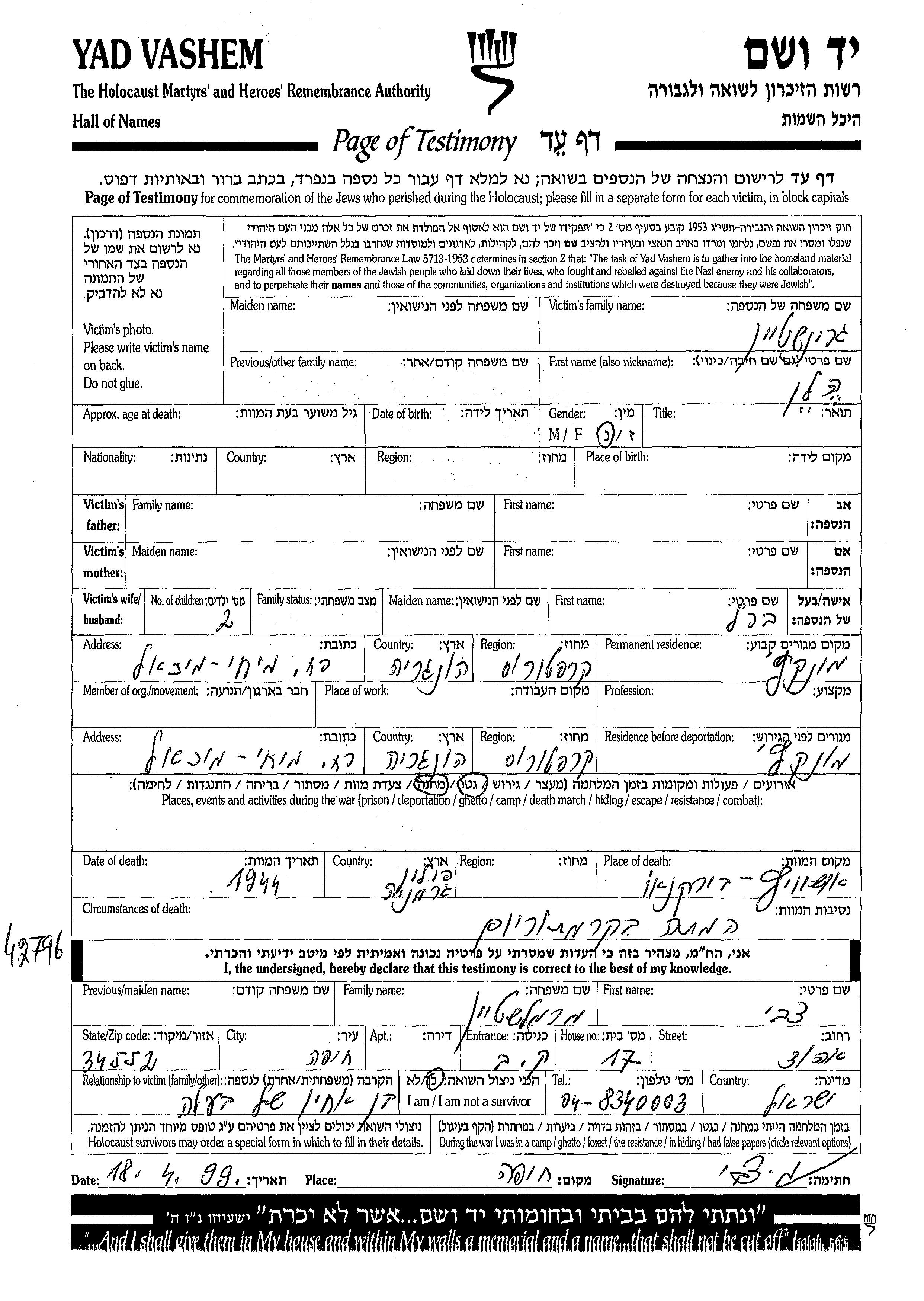 Яд Вашем - Листы свидетельских показаний Мемориального фонда