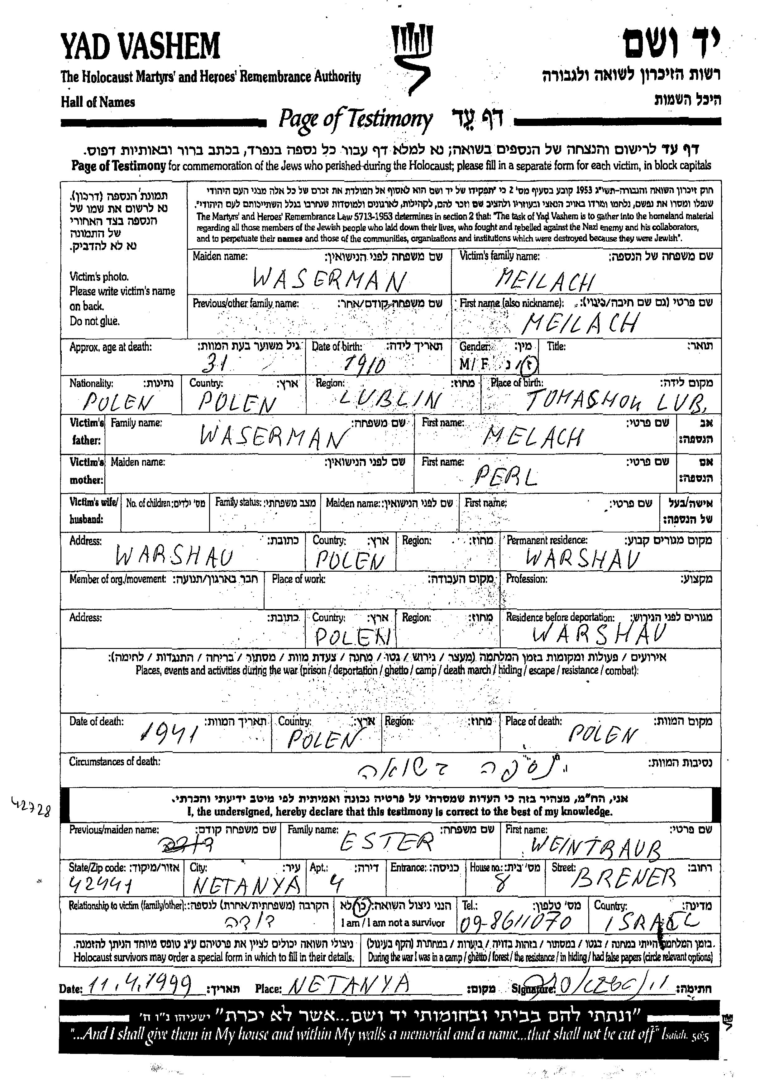 Мейлах Васерман, место рождения: Томашув-Любельски, Польша. Отец: Мелах, mать:Перл. Место жительства до войны: Варшава, Польша. Место во время войны: Варшава, Польша.