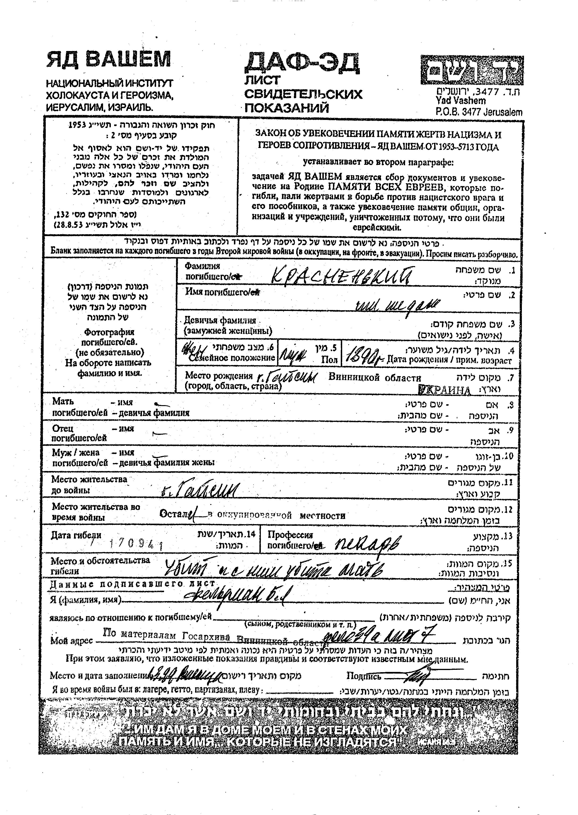 Яд Вашем - Листы свидетельских показаний Мемориального фонда