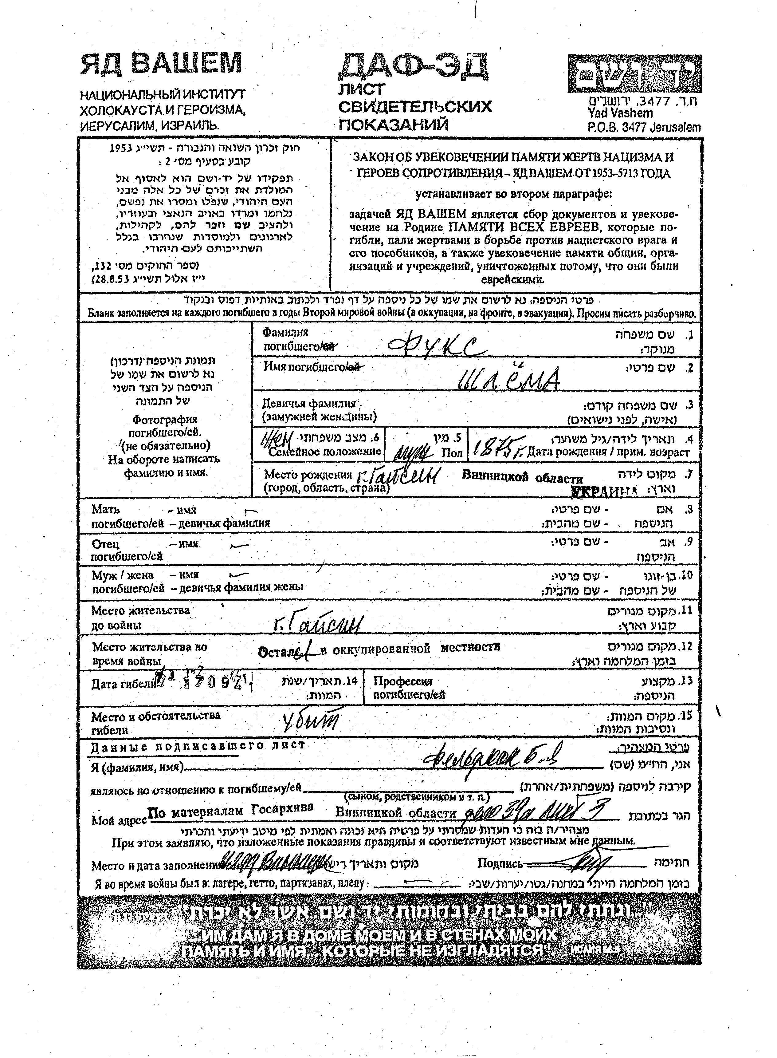 Шлема Фукс, место рождения: Гайсин, Украина (СССР). Женат / замужем. Место жительства до войны: Гайсин, Украина (СССР). Место во время войны: Гайсин, Украина (СССР).