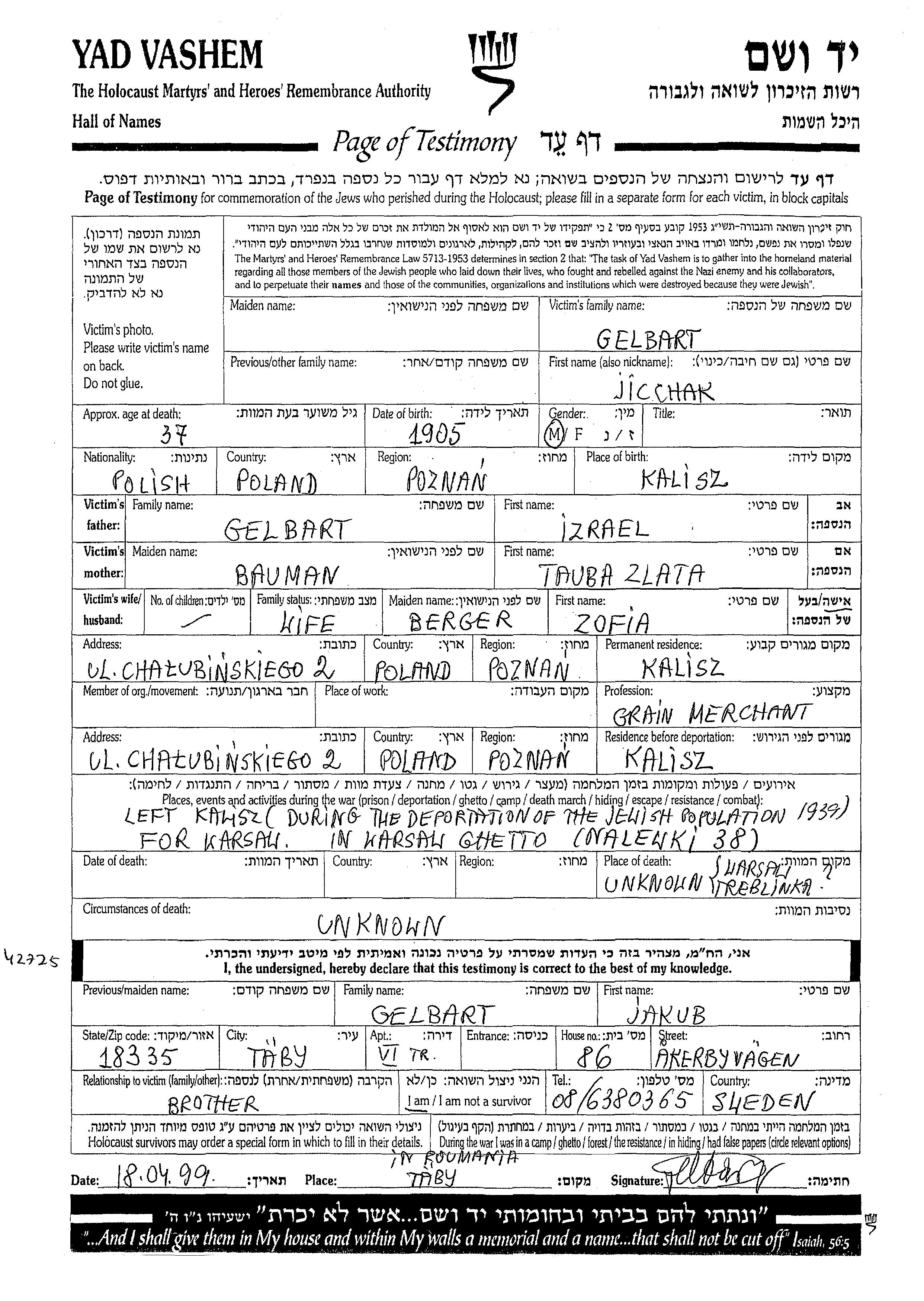 Гельбарт Ицхак 1905 Калиш, Польша Лист свидетельских показаний