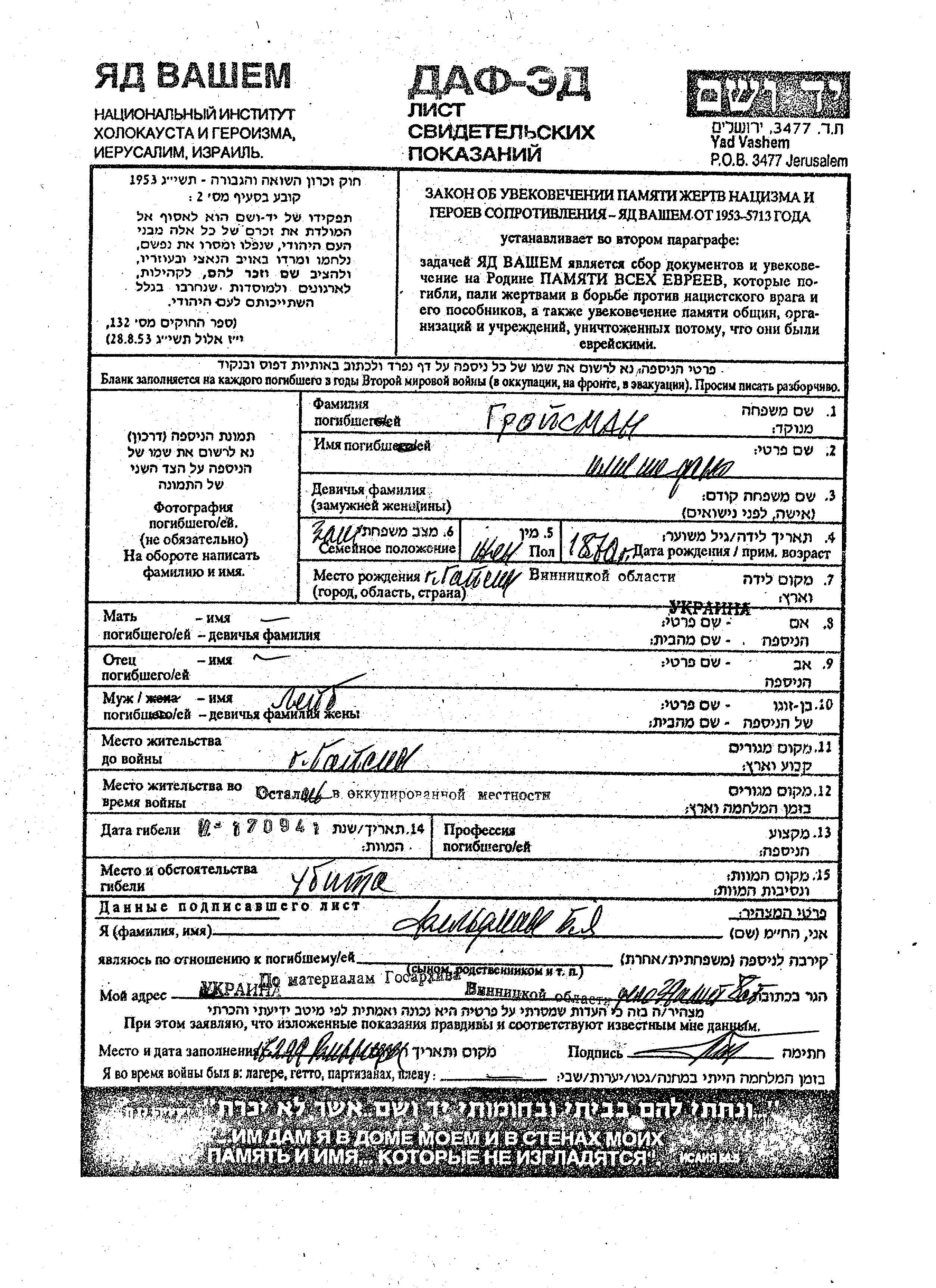 Гройсман Имя неизвестно 1870 Гайсин, Украина (СССР) Лист свидетельских показаний