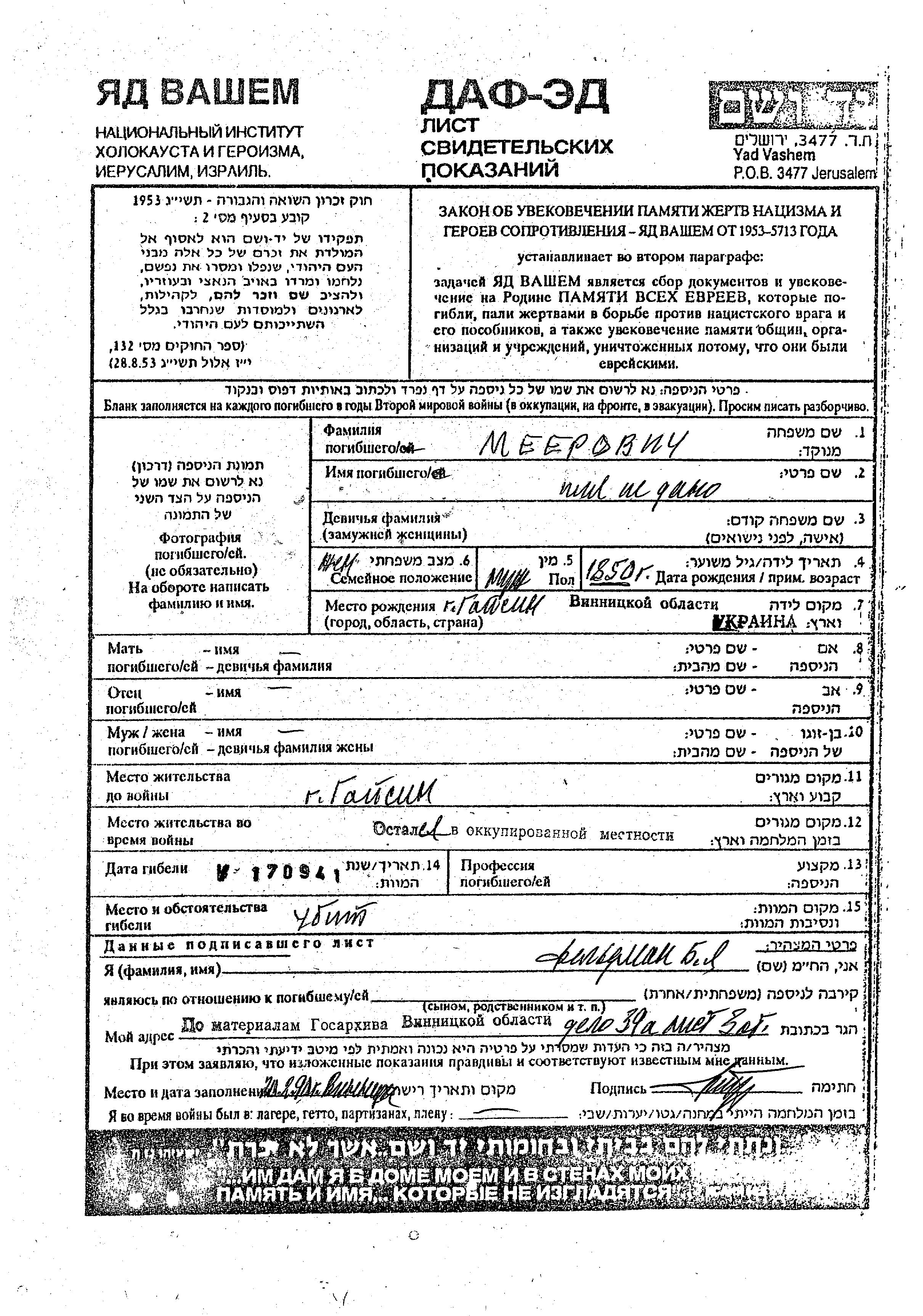 Яд Вашем - Листы свидетельских показаний Мемориального фонда