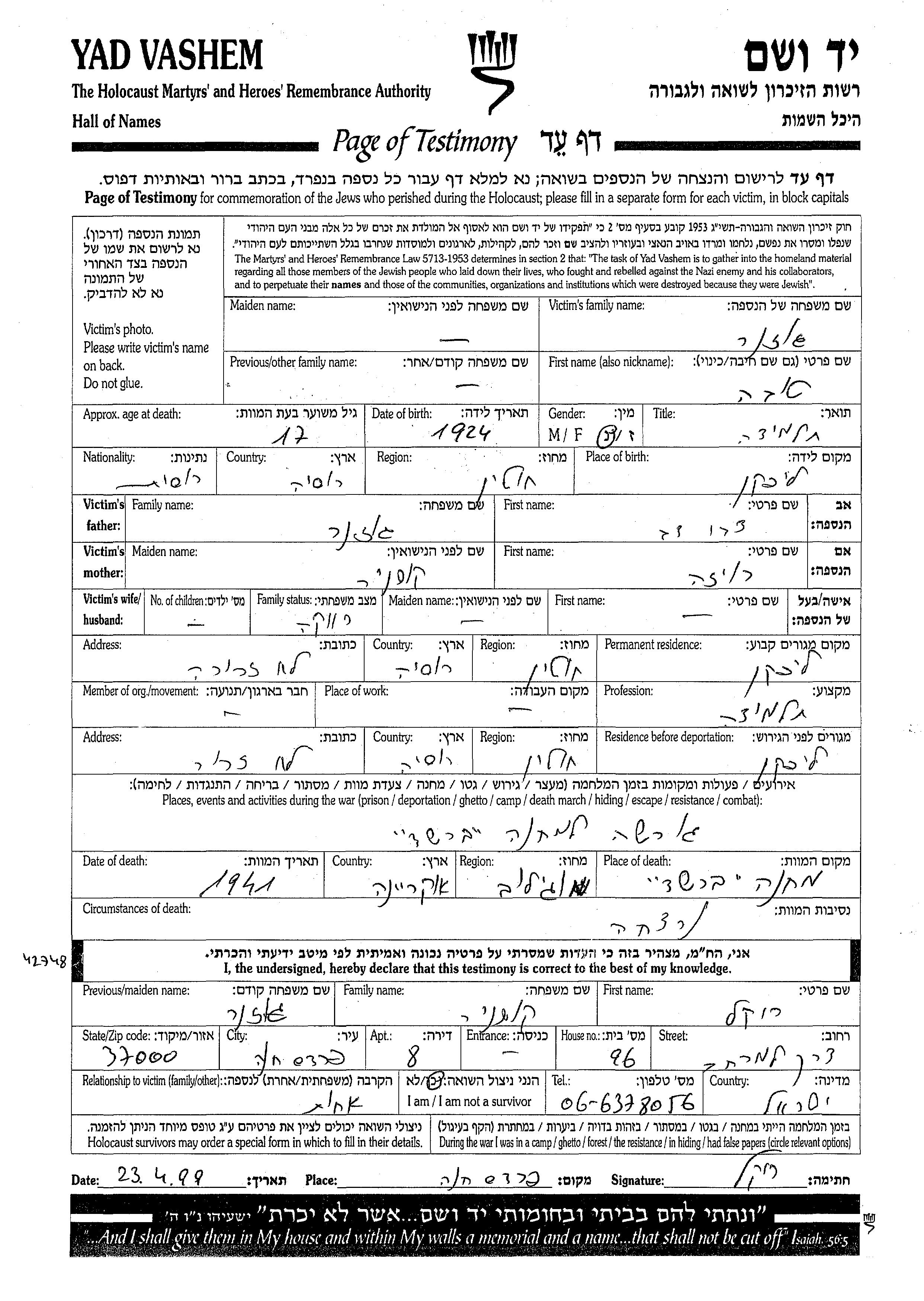 Яд Вашем - Листы свидетельских показаний Мемориального фонда