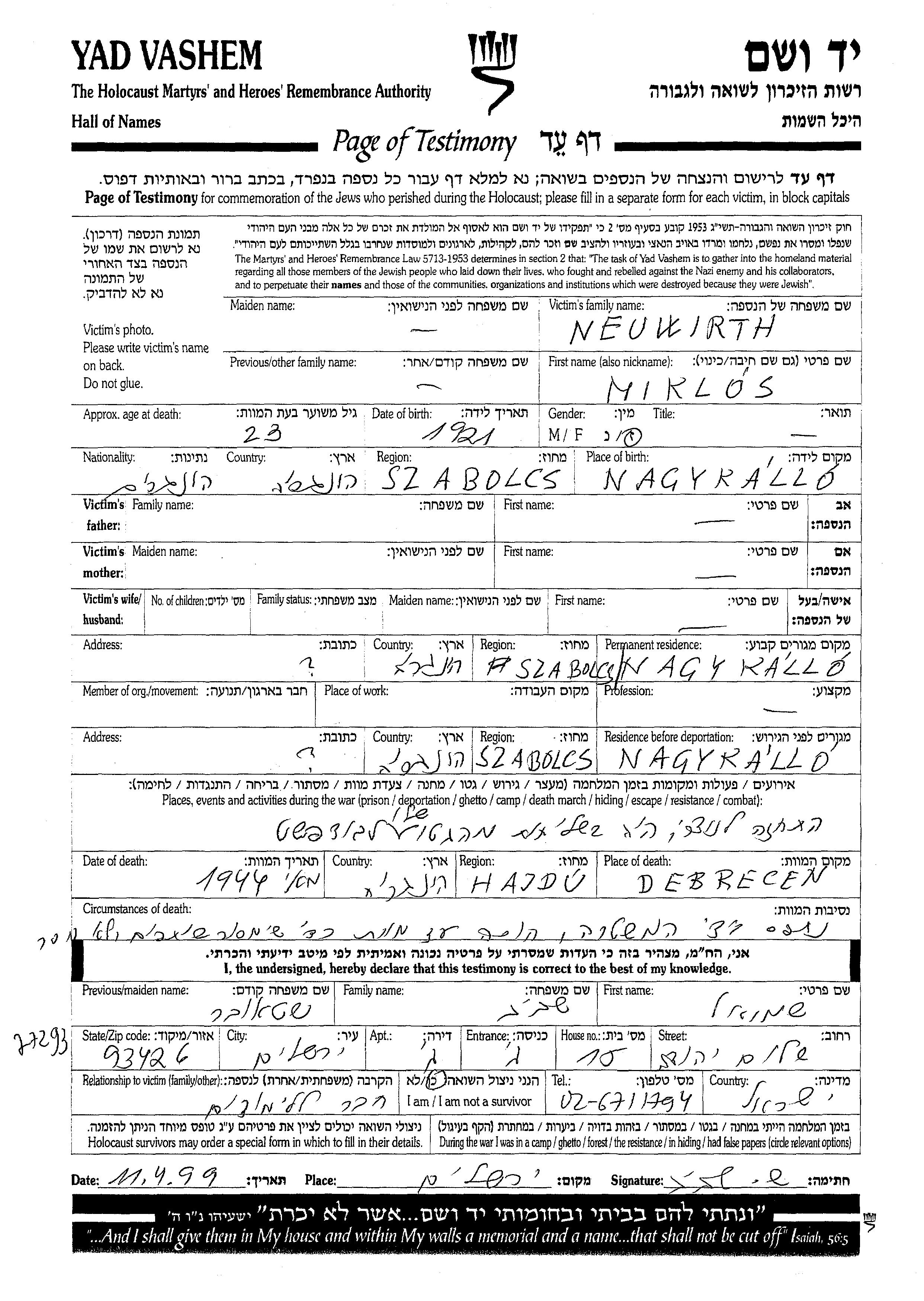 Миклош Нойвирт, место рождения: Надькалло, Венгрия. Место жительства до войны: Надькалло, Венгрия. Место во время войны: Надькалло, Венгрия.