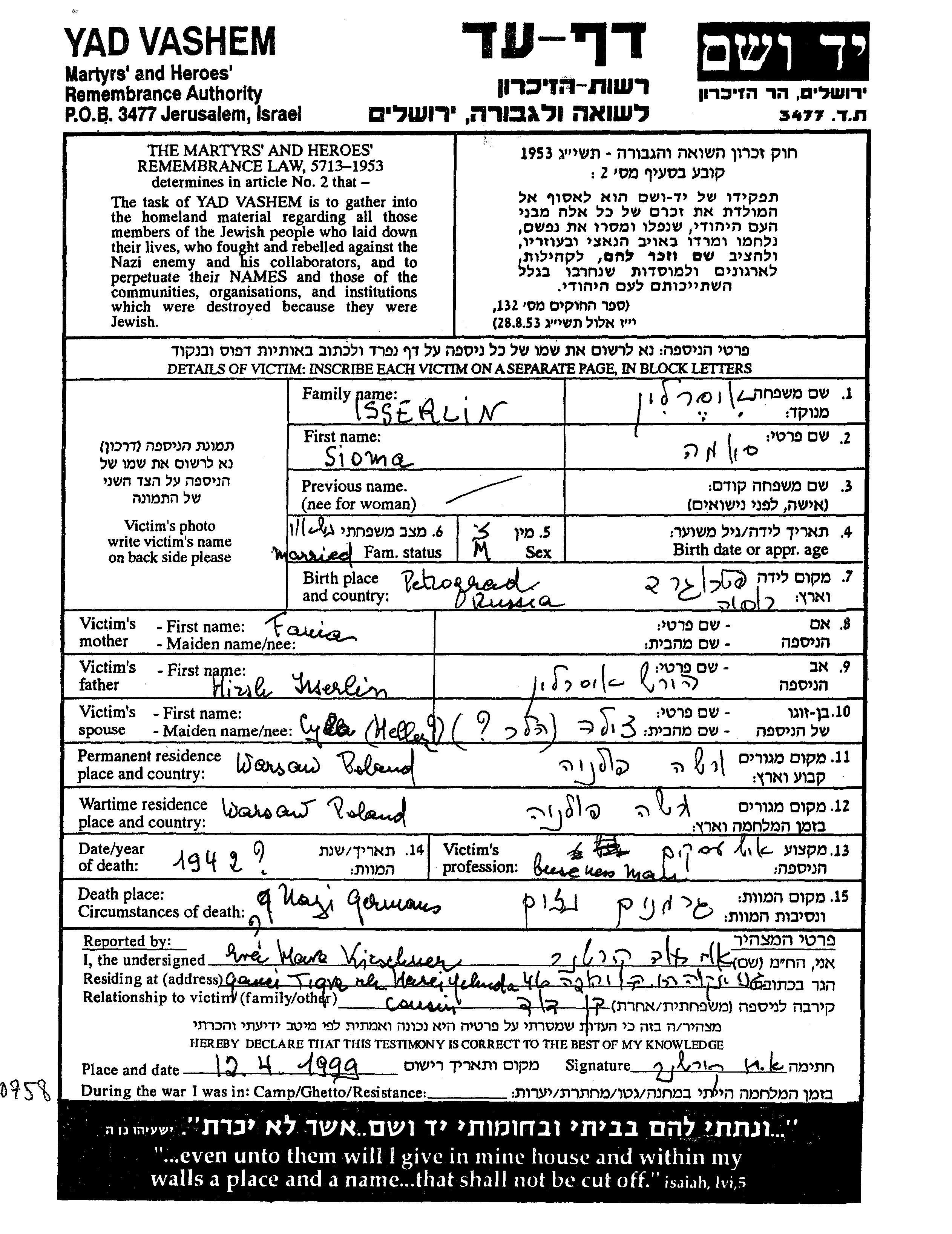 Сёма Иссерлин, место рождения: Петроград, Россия (СССР). Отец: Хирш, mать:Фаня. Предприниматель. Женат / замужем. Место жительства до войны: Варшава, Польша. Место во время войны: Варшава, Польша.