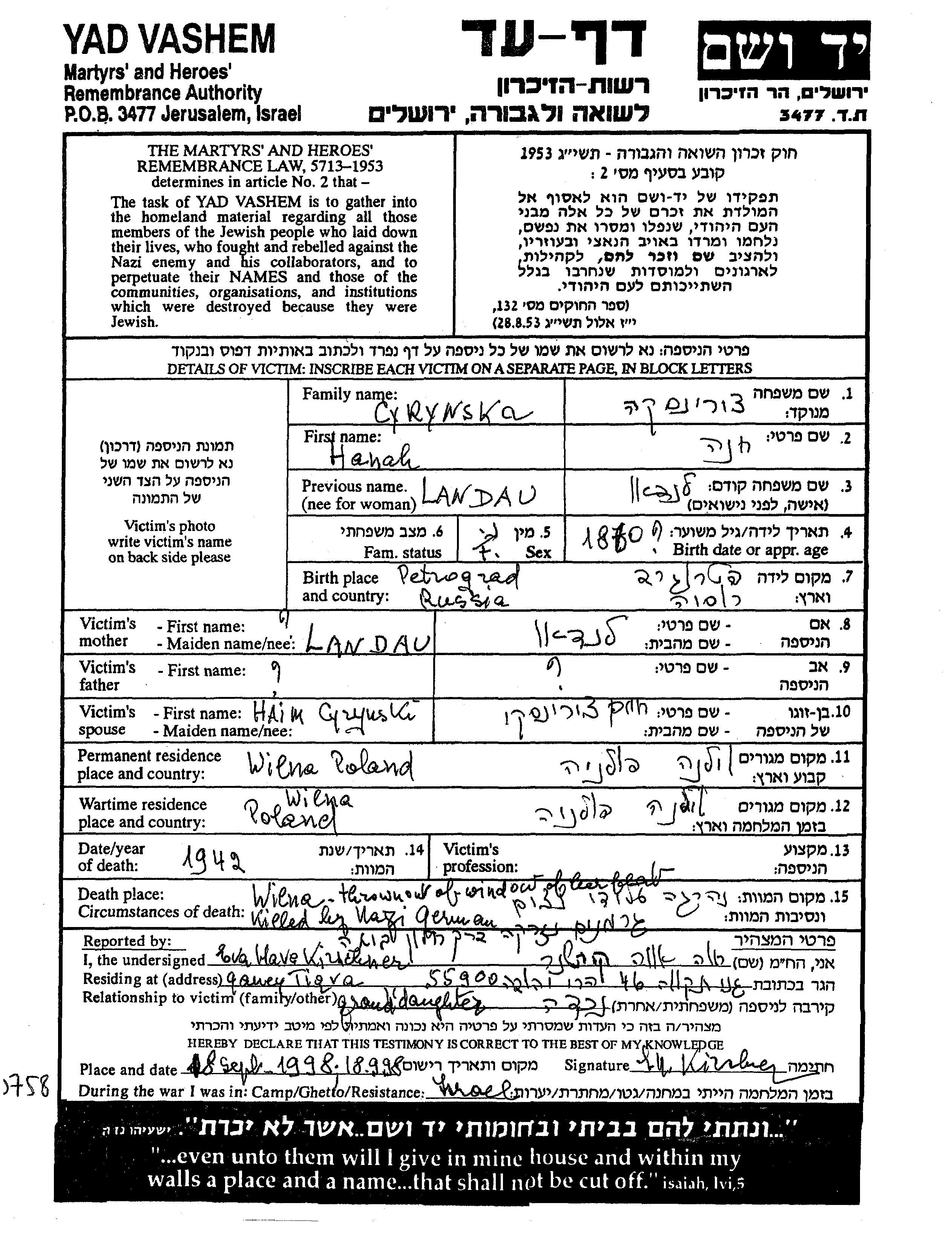 Хана Цырынска, девичья фамилия Ландау, место рождения: Петроград, Россия (СССР). Женат / замужем. Место жительства до войны: Вильно, Польша. Место во время войны: Вильно, Польша.