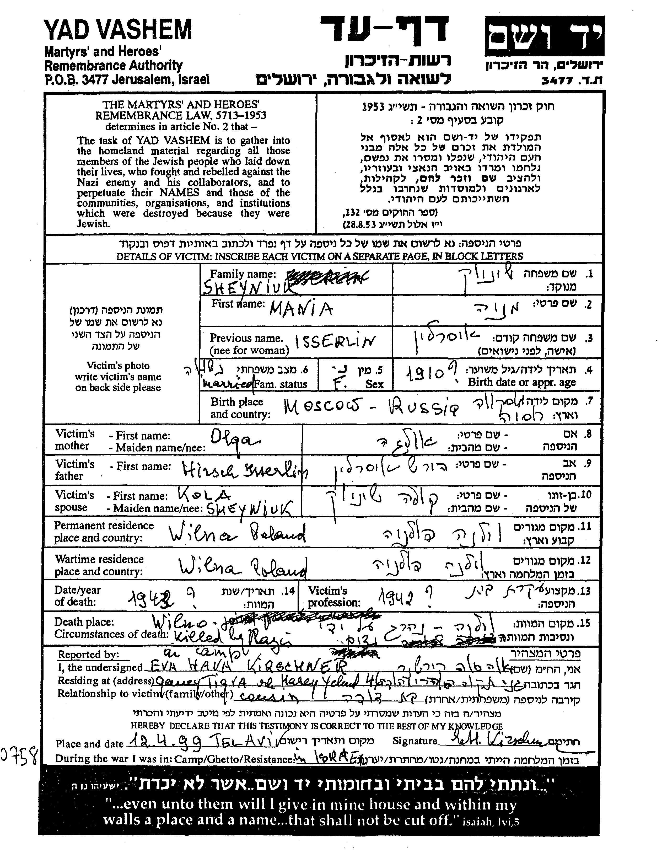Маня Шейнюк, девичья фамилия Иссерлин, место рождения: Москва, Россия (СССР). Отец: Гирш, mать:Ольга. Домохозяйка. Женат / замужем. Место жительства до войны: Вильно, Польша. Место во время войны: Вильно, Польша.