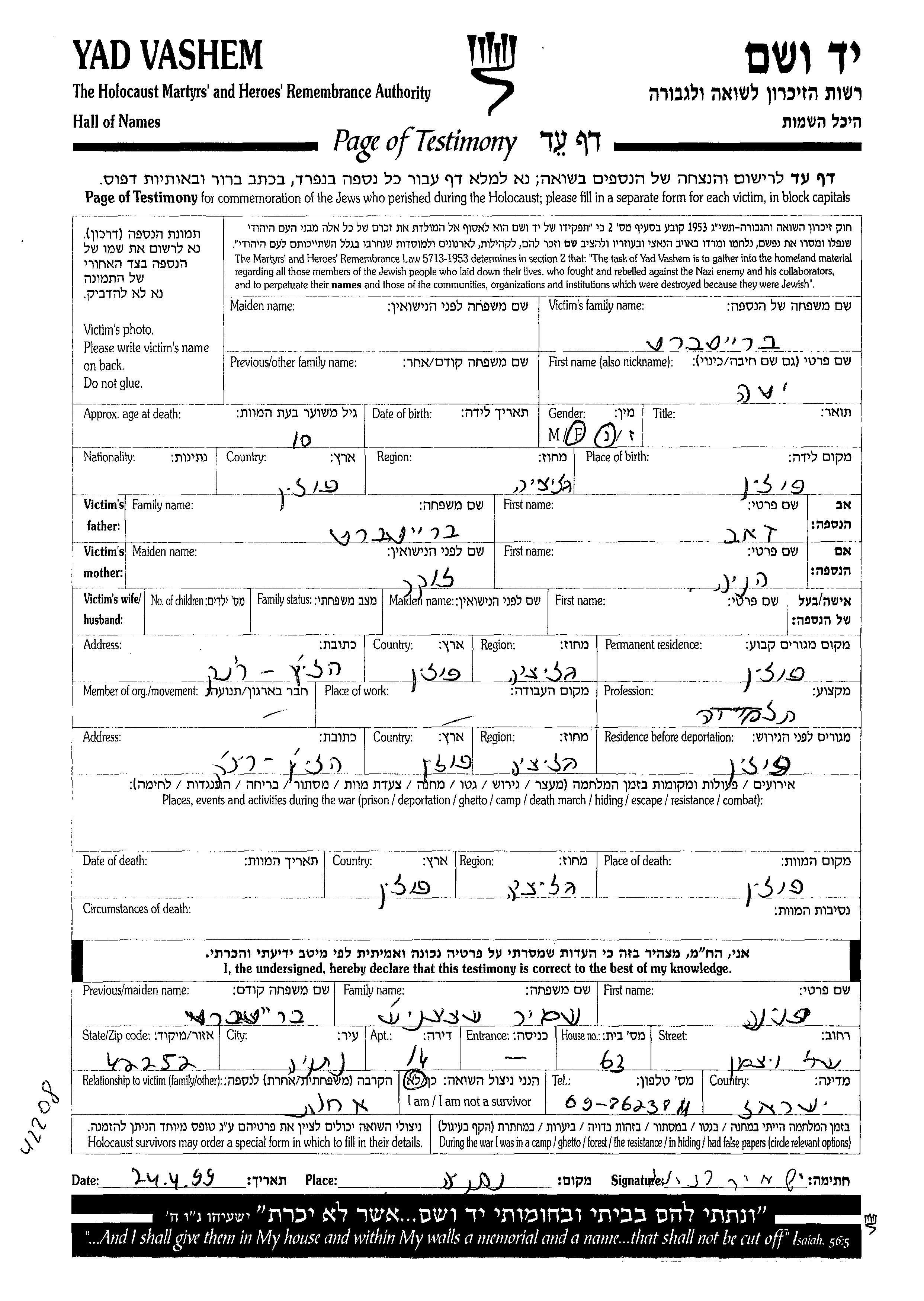 Яд Вашем - Листы свидетельских показаний Мемориального фонда