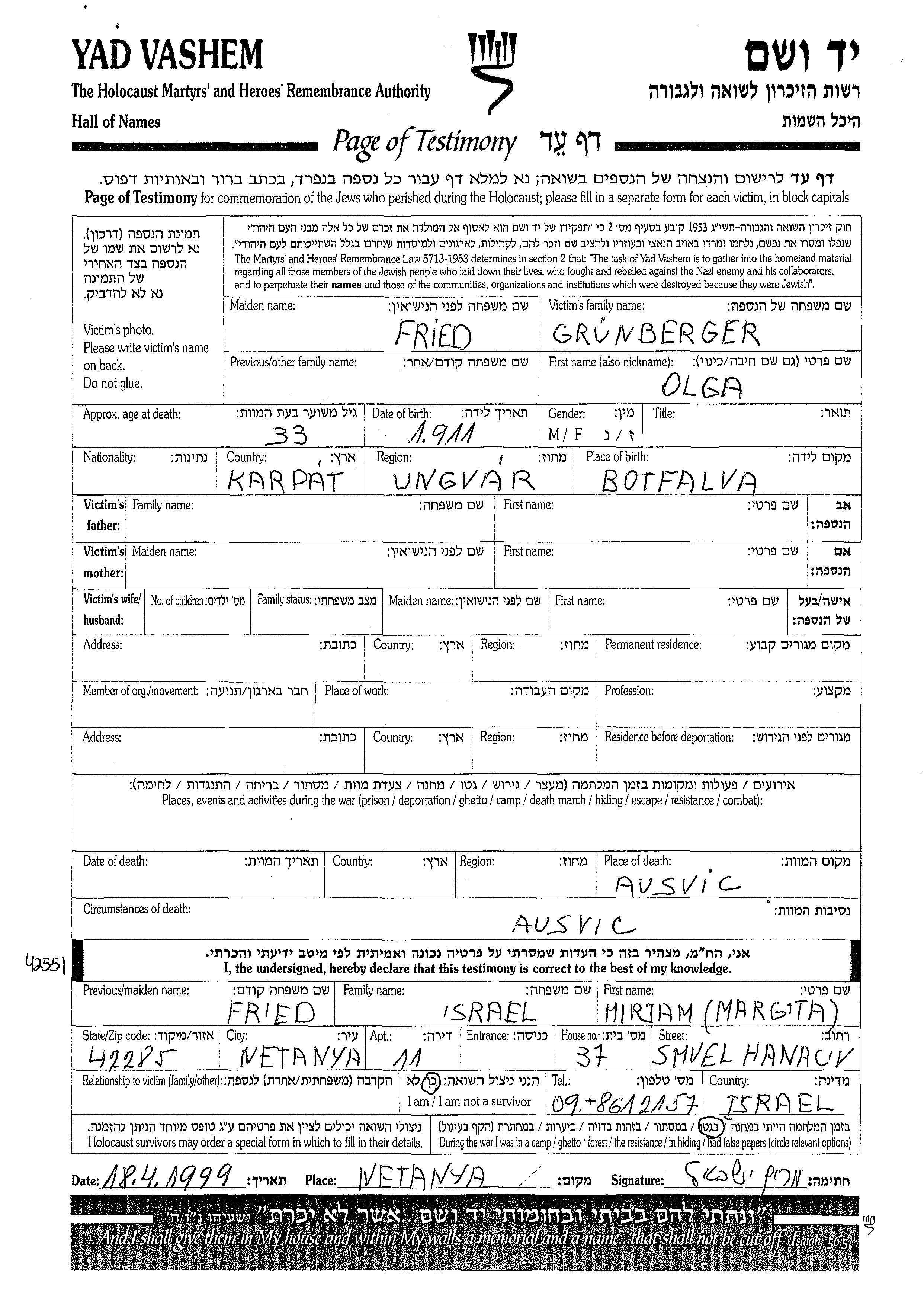 Яд Вашем - Листы свидетельских показаний Мемориального фонда
