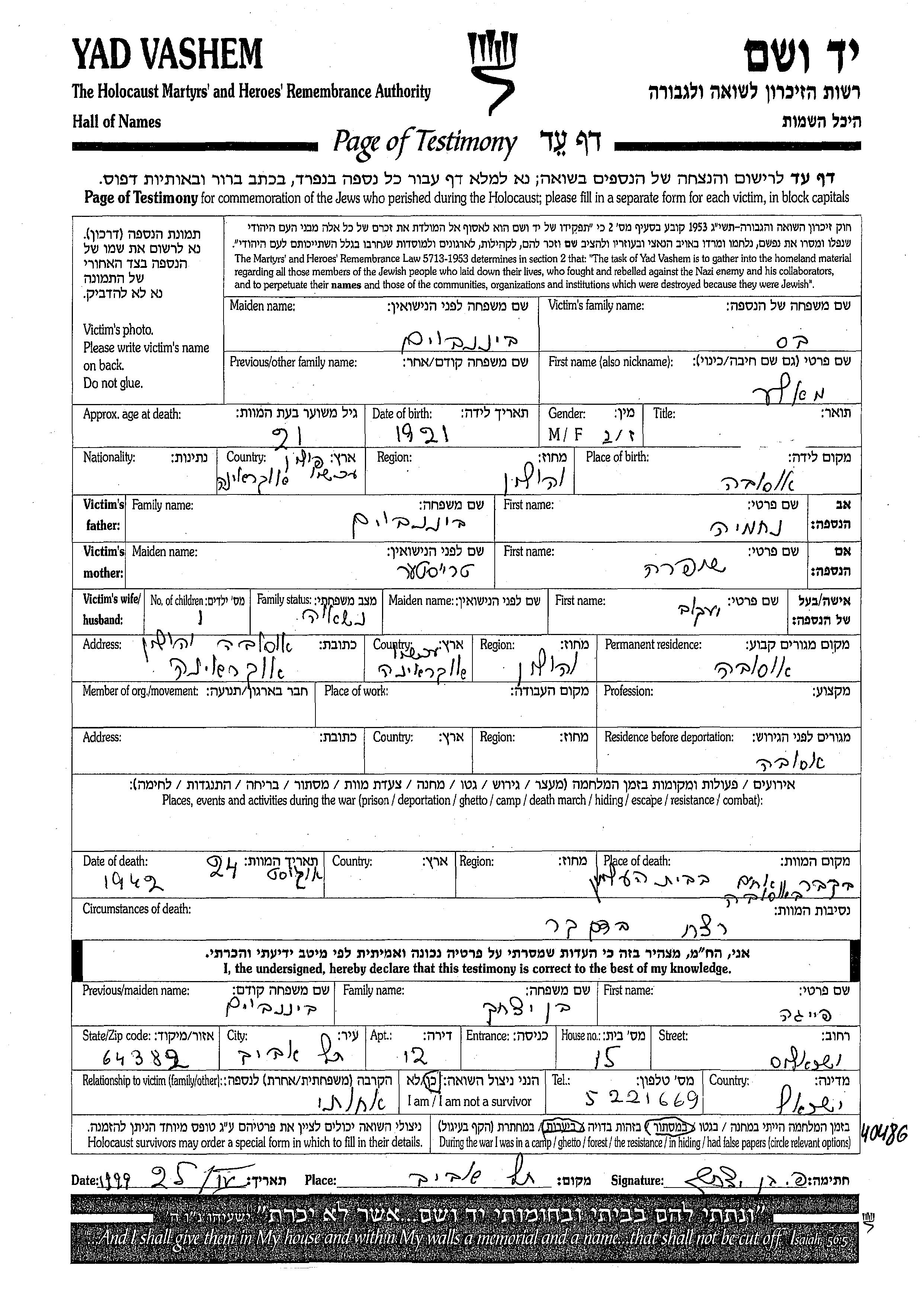 Яд Вашем - Листы свидетельских показаний Мемориального фонда