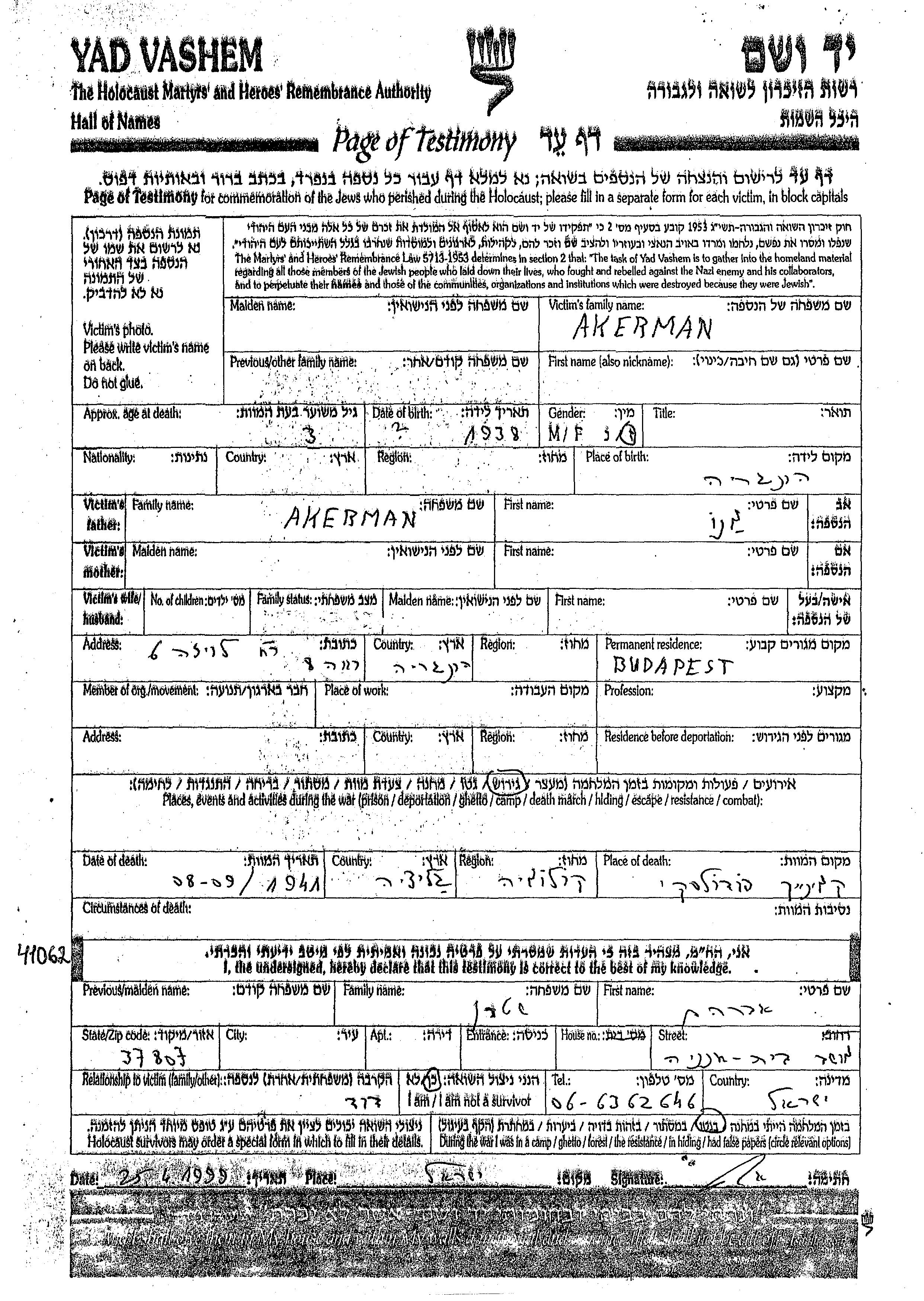 Акерман Имя неизвестно 1938 Будапешт, Венгрия Лист свидетельских показаний