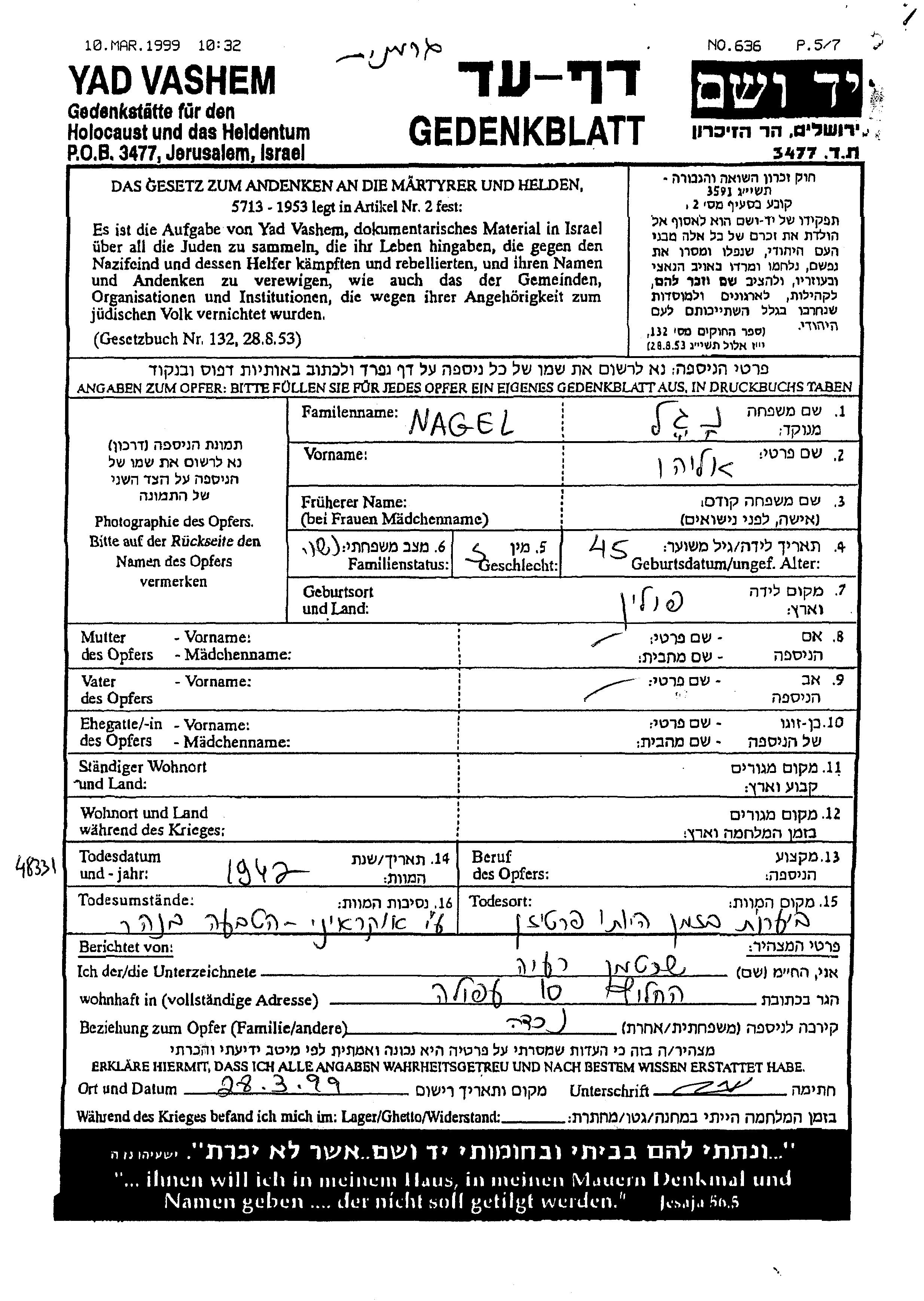 Нагель Элиягу место не указано, Лист свидетельских показаний
