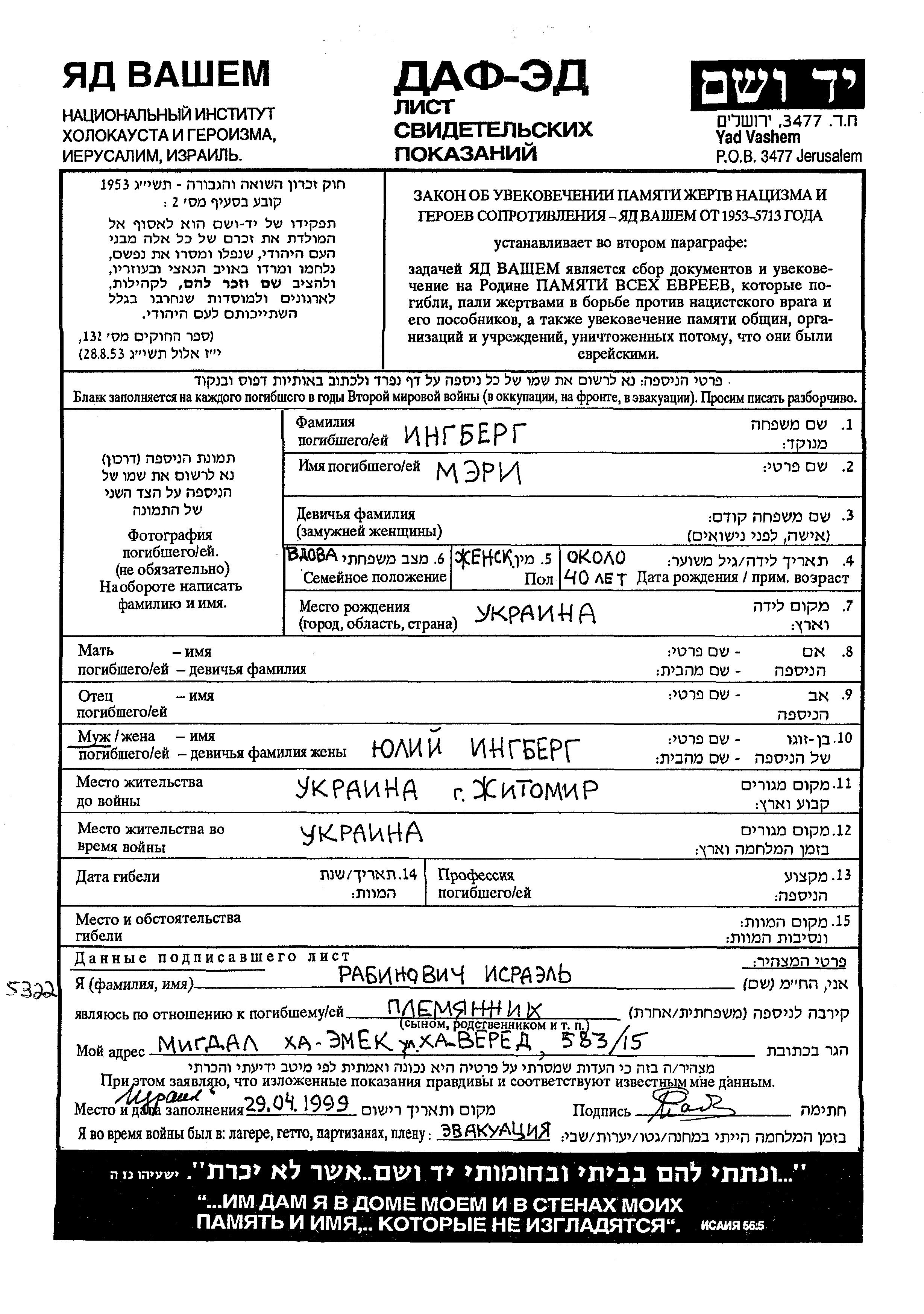 Во время Шоа евреев уничтожали разными способами: газовые камеры, расстрелы, их заживо хоронили или сжигали, непосильным принудительным трудом, голодом, эпидемиями, отсутствием минимальных гигиенических условий и медицинского обслуживания, и т.д. Некоторые евреи добровольно расстались со своей жизнью, чтобы избежать ареста и дальнейших преследований или чтобы покончить с безысходностью и бесконечными страданиями. Десятки тысяч еврейских солдат, служивших в Советской армии и попавших в плен, , были отобраны как евреи и убиты. Многие были зарегистрированы как «пропавшие без вести».