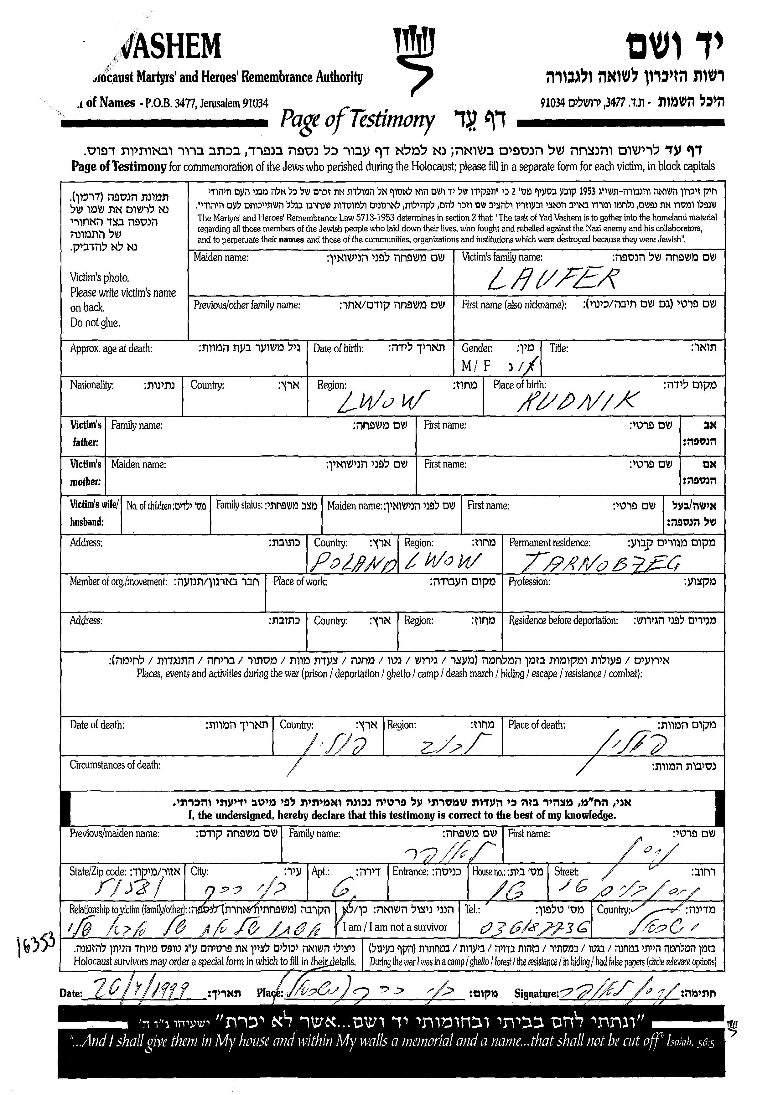 Лауфер Имя неизвестно Тарнобжег, Польша Лист свидетельских показаний