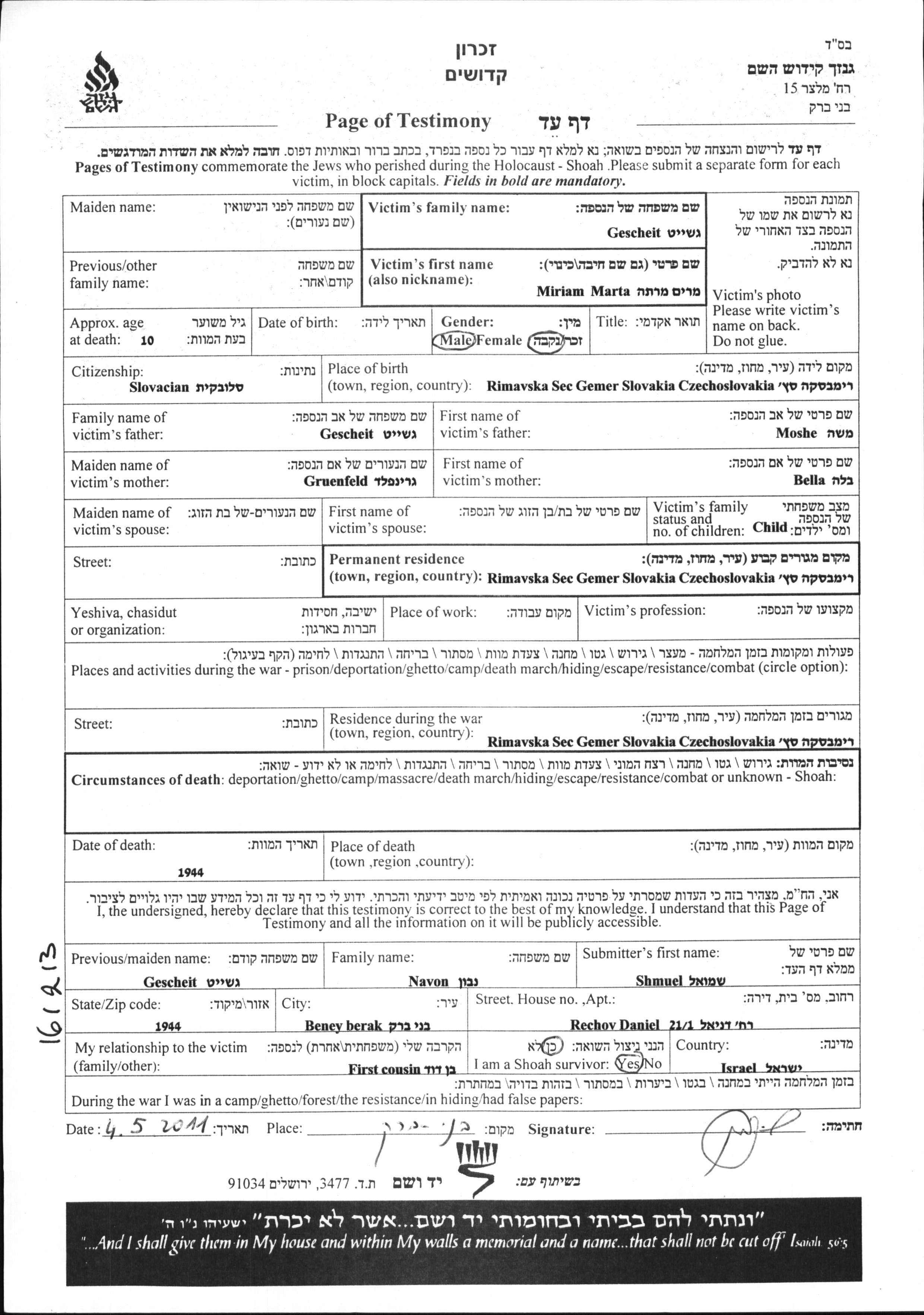 Мирьям Марта Гешайт, место рождения: Римавска Сеч, Чехословакия. Отец: Моше, mать:Белла, девичья фамилия Грюнфельд. Ребенок. Место жительства до войны: Римавска Сеч, Чехословакия. Место во время войны: Римавска Сеч, Чехословакия.