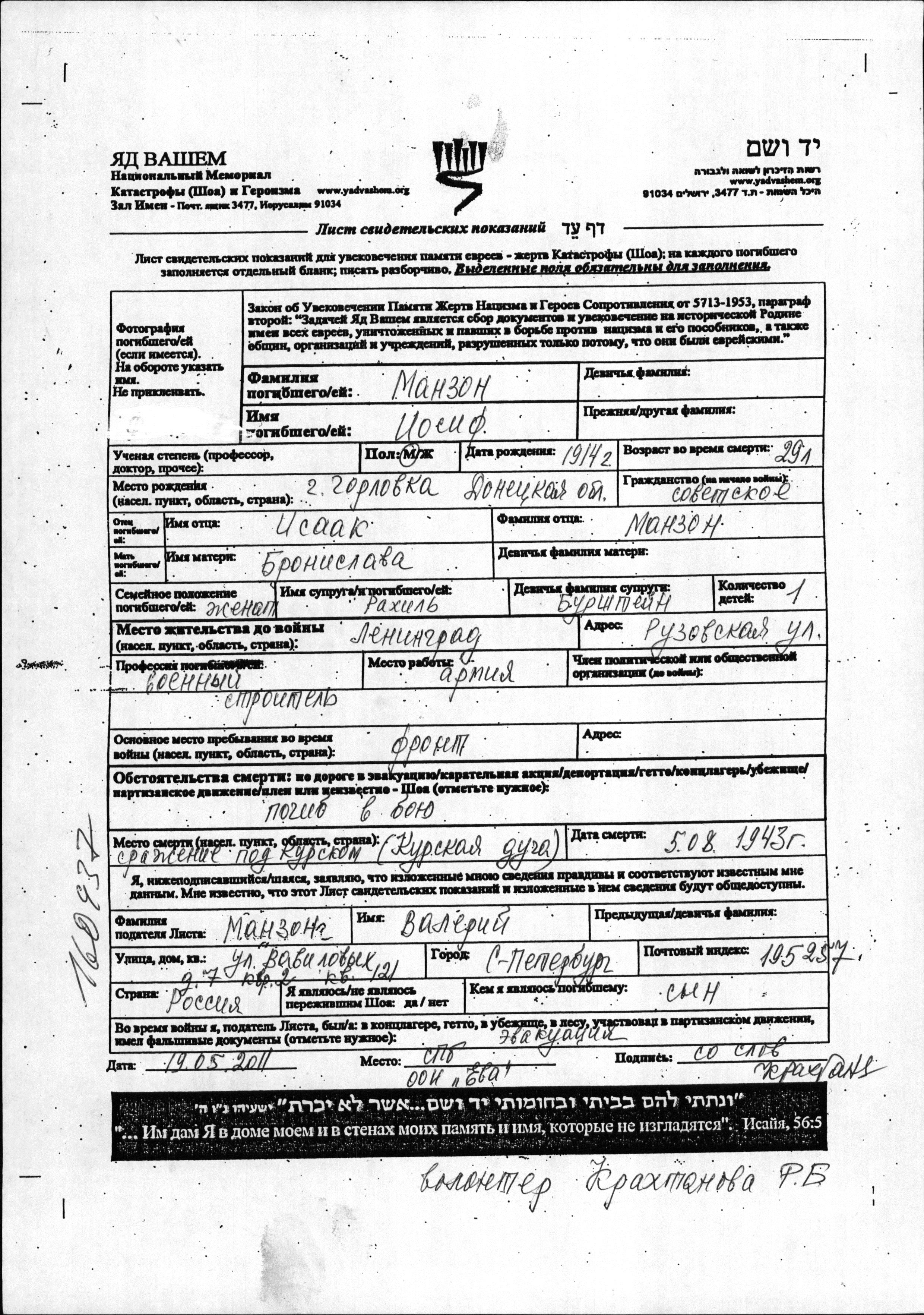 Иосиф Манзон, место рождения: Горловка, Украина (СССР). Отец: Исаак, mать:Бронислава. Voyenny stroitel russian. Женат / замужем. Место жительства до войны: Ленинград, Россия (СССР). Место во время войны: Вооруженные силы Советского Союза. Иосиф погиб на военной службе. место смерти: Kurskaya Duga, Россия (СССР) в 05/08/1943.