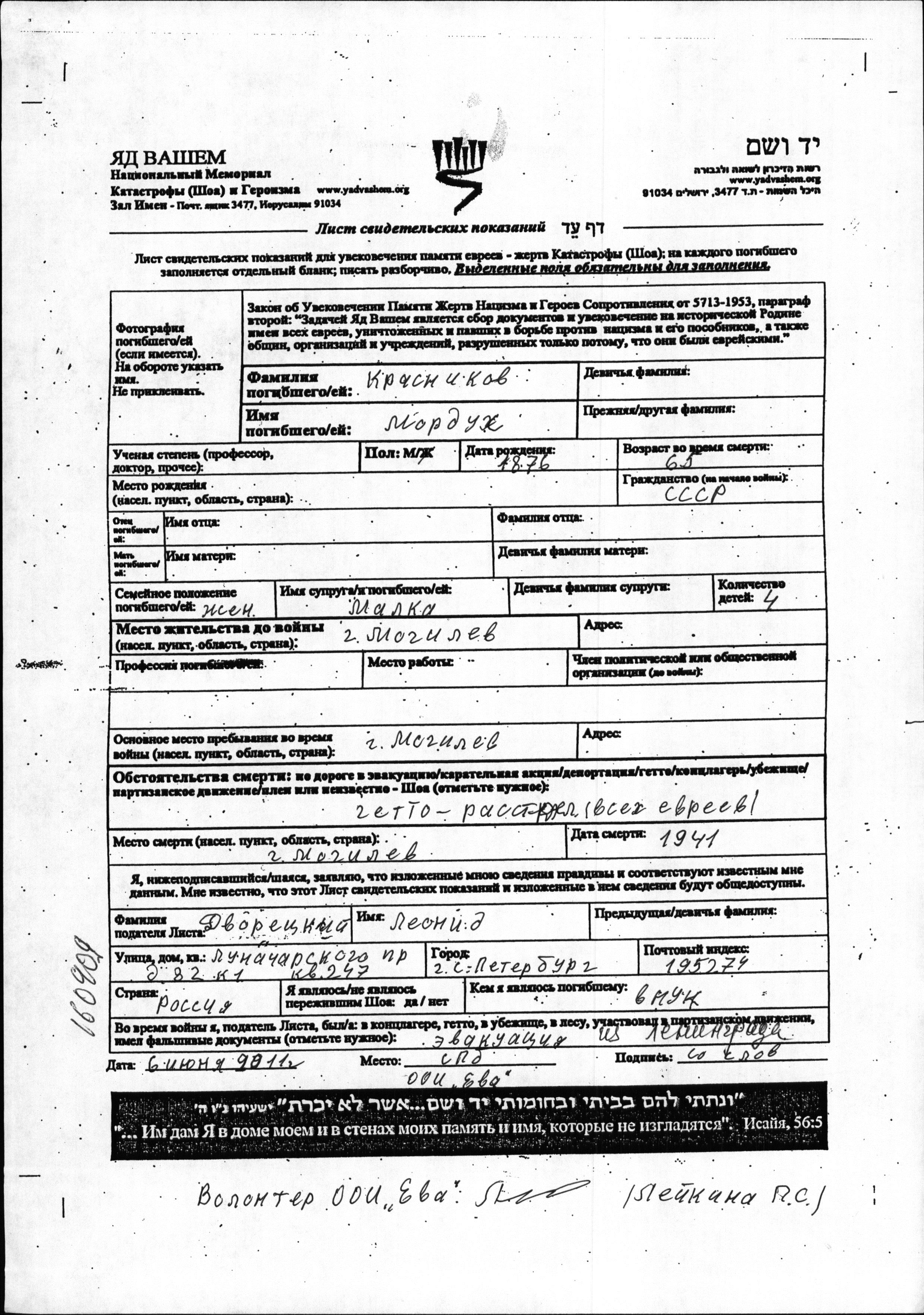 Красников Мордух 1876 Могилёв, Белоруссия (СССР) Лист свидетельских показаний