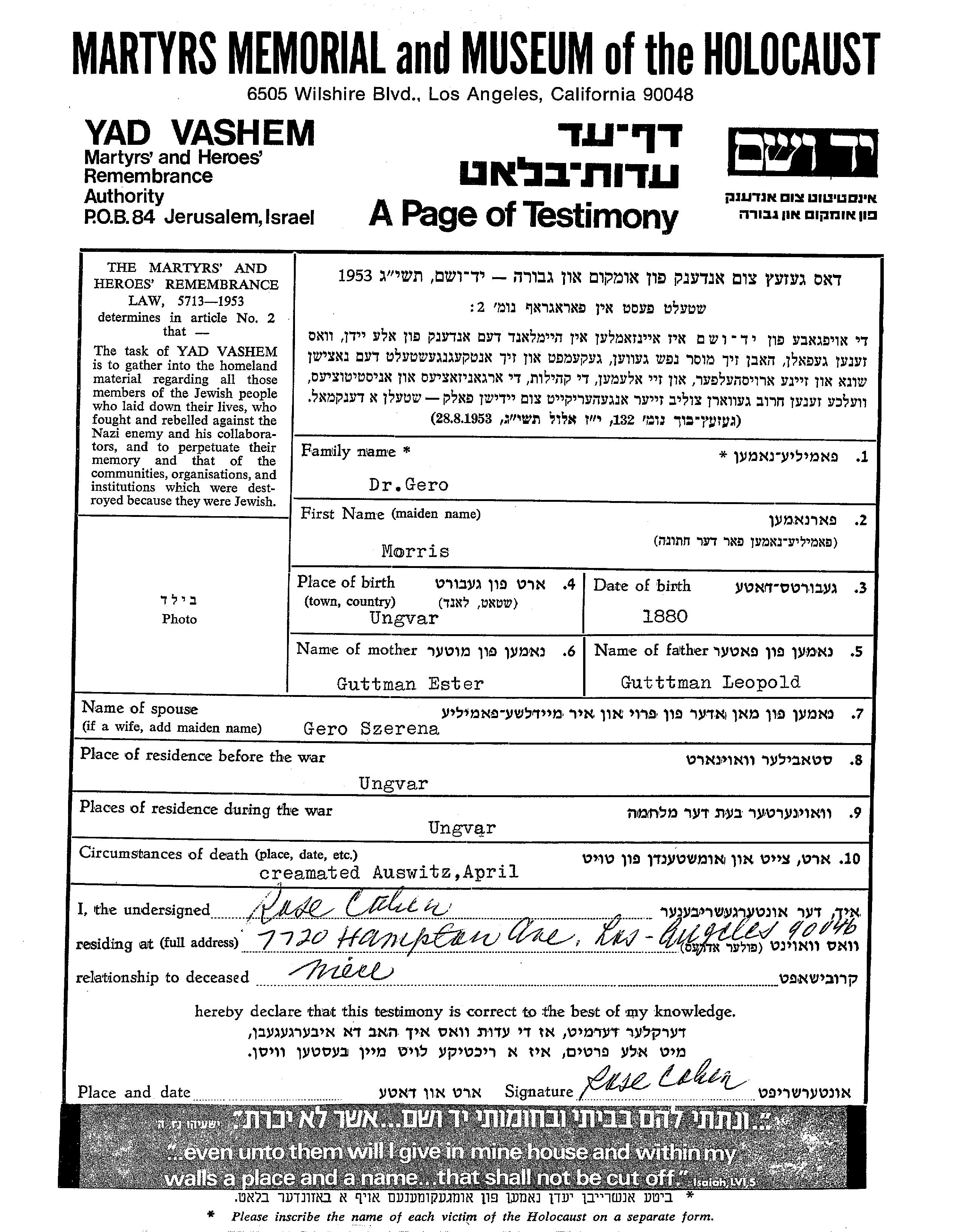 Др. Моррис Геро Гуттман, место рождения: Унгвар, Чехословакия. Отец: Леопольд, mать:Эстер. Женат / замужем. Место жительства до войны: Унгвар, Чехословакия. Место во время войны: Унгвар, Чехословакия.