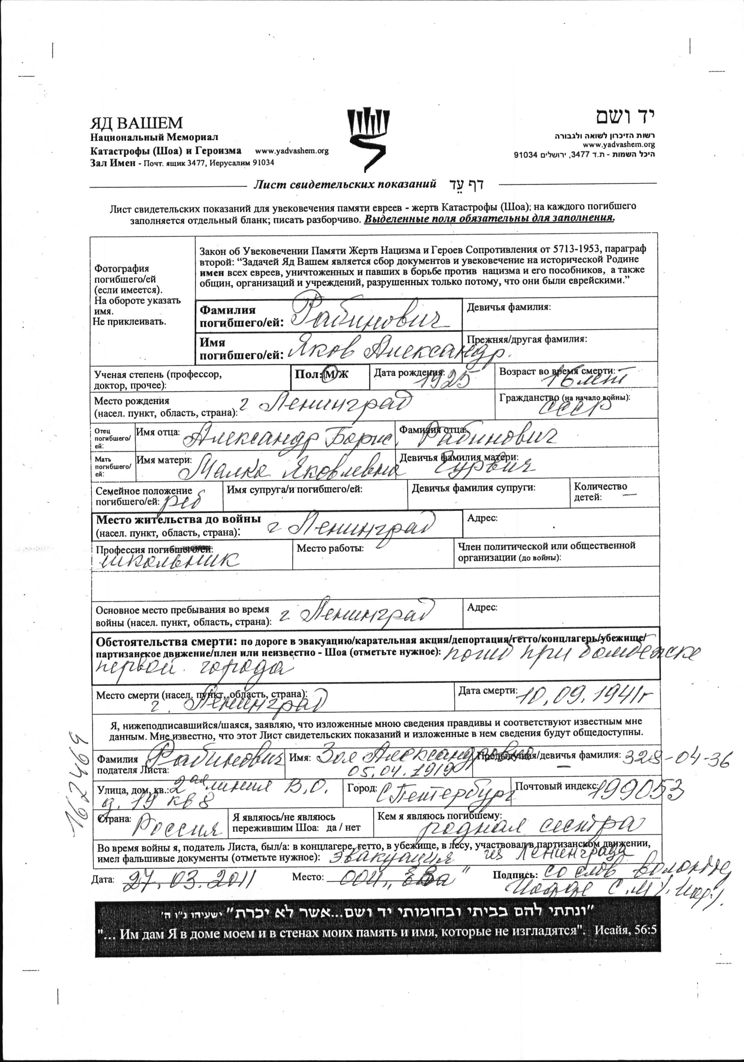 Рабинович Яков 1925 Ленинград, Россия (СССР) Лист свидетельских показаний