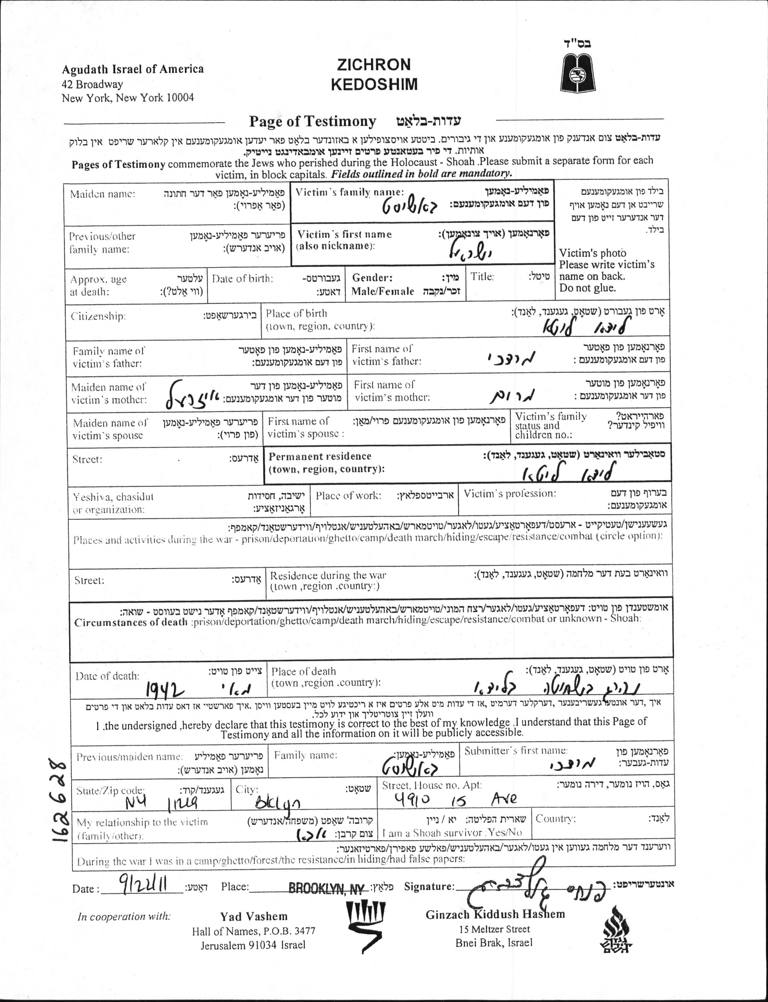 Исраэль уничтожен в период Шоа. место смерти: Лида, Польша в 05/1942.