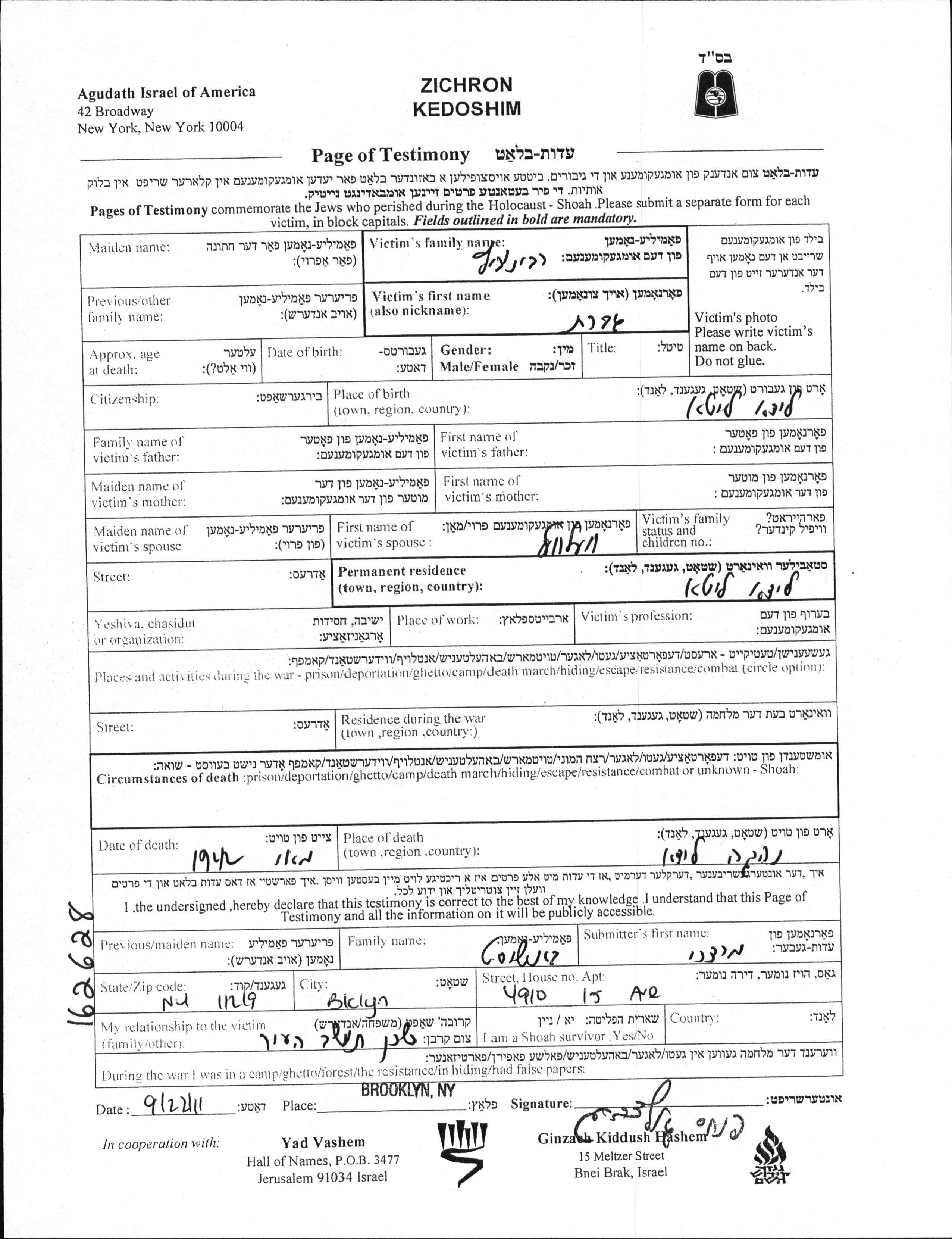 Яд Вашем - Листы свидетельских показаний Мемориального фонда
