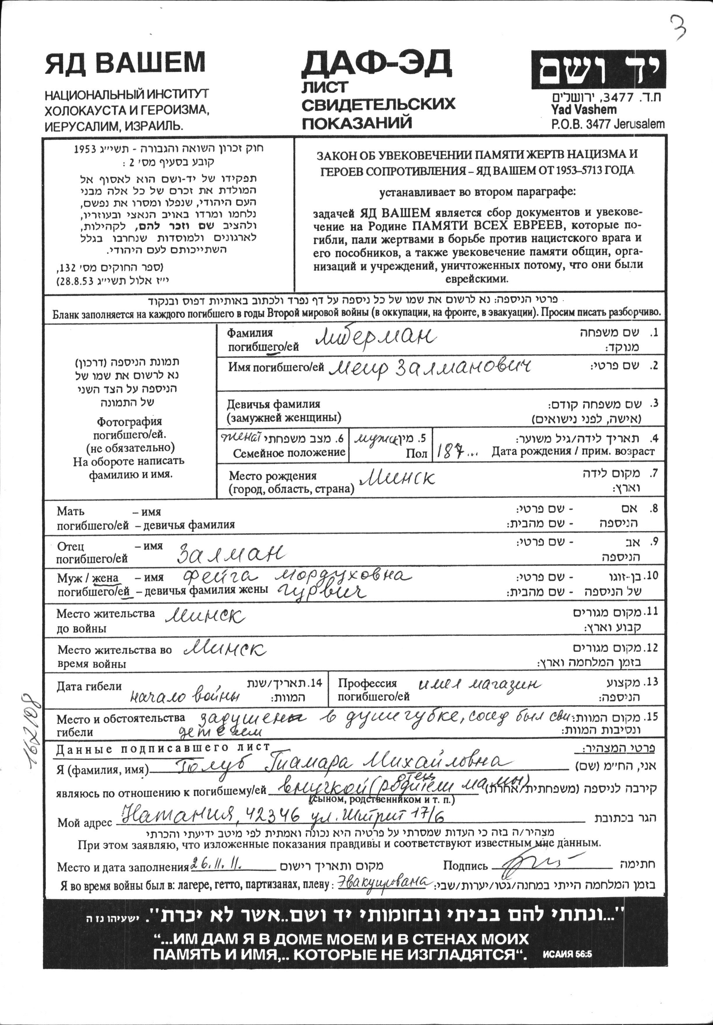 Либерман Меир 1875 Минск, Белоруссия (СССР) Лист свидетельских показаний