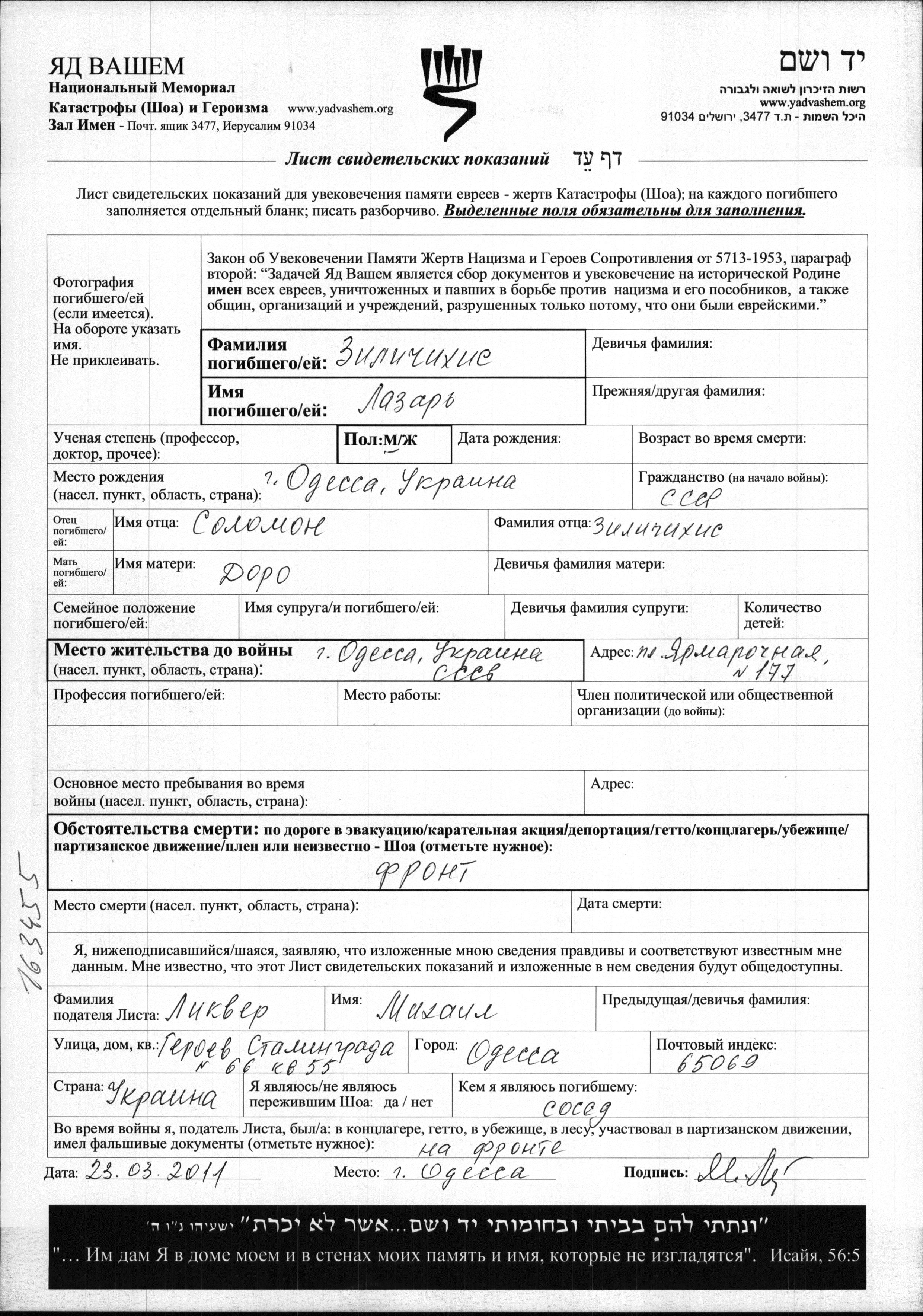 Зиличихис Лазарь Одесса, Украина (СССР) Лист свидетельских показаний
