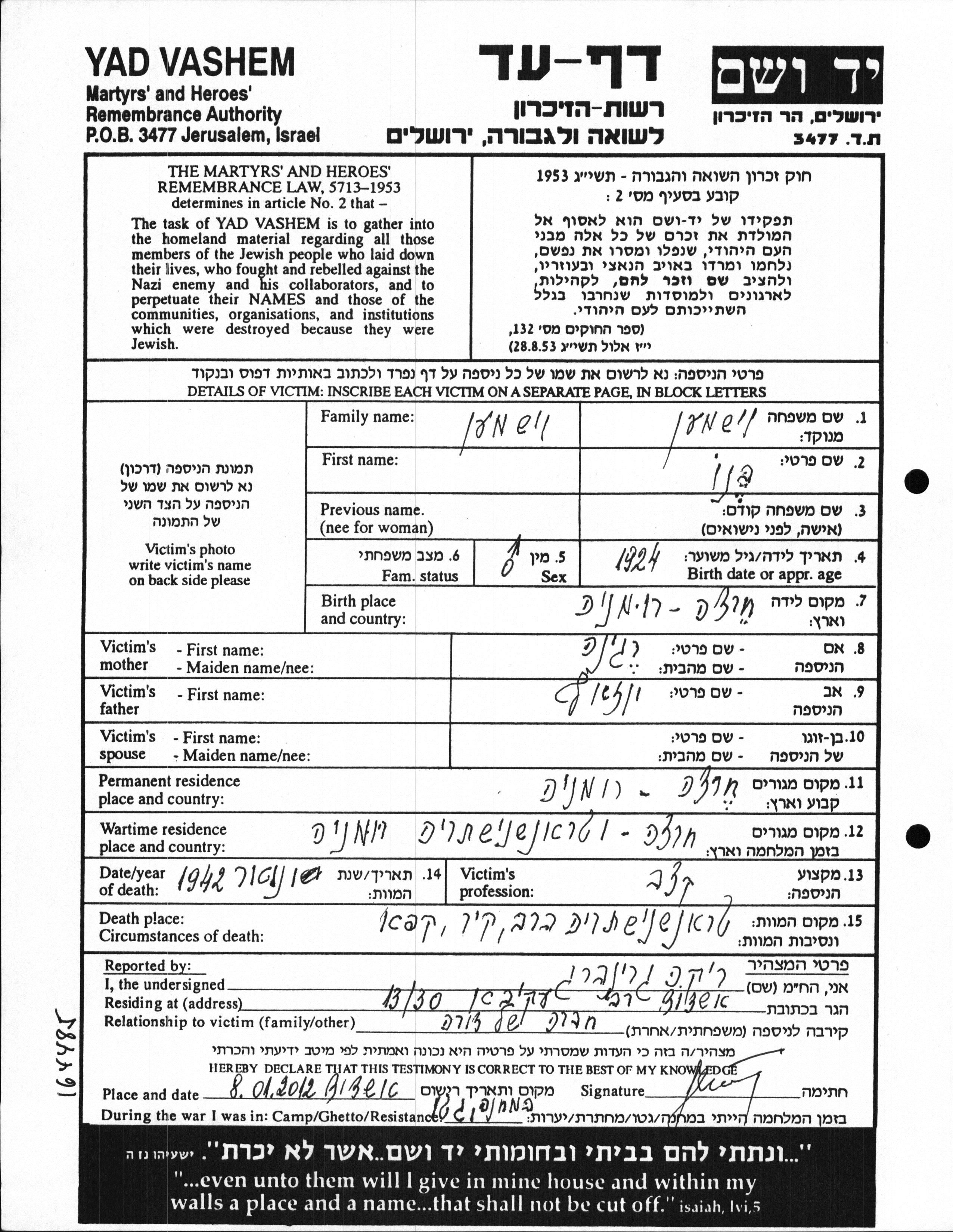 Яд Вашем - Листы свидетельских показаний Мемориального фонда