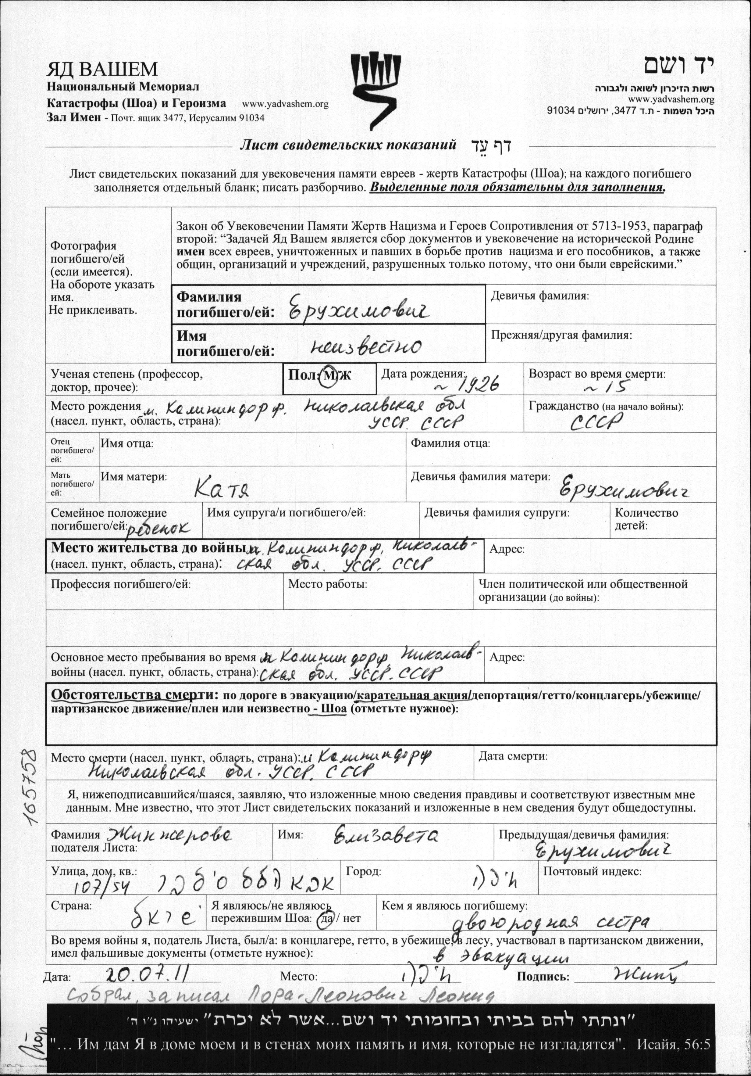 Ерухимович Имя неизвестно 1926 Калининдорф, Украина (СССР) Лист свидетельских показаний