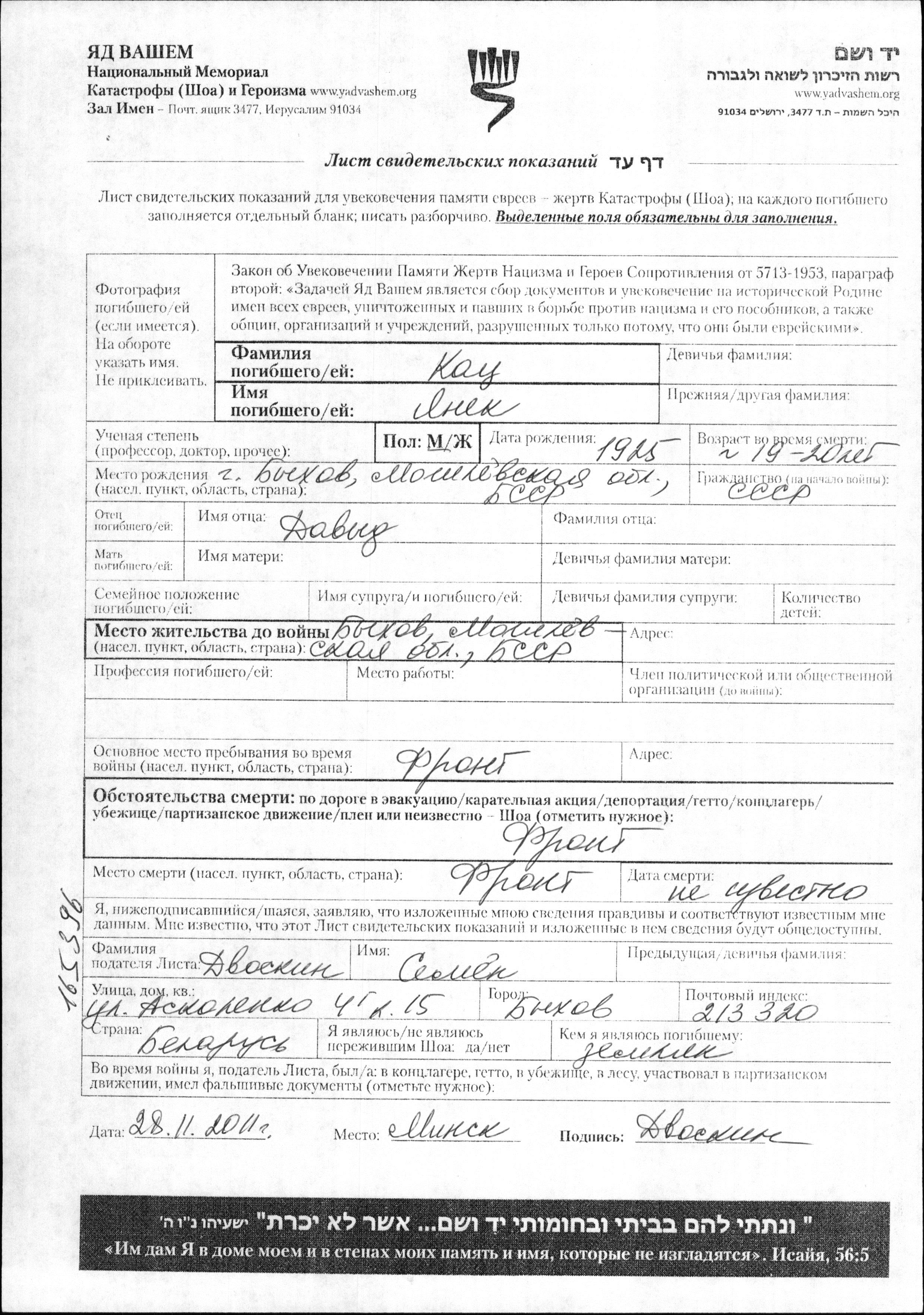 Янек Кац, место рождения: Быхов, Белоруссия (СССР). Отец: Давид. Место жительства до войны: Быхов, Белоруссия (СССР). Место во время войны: Вооруженные силы Советского Союза. Янек погиб на военной службе.