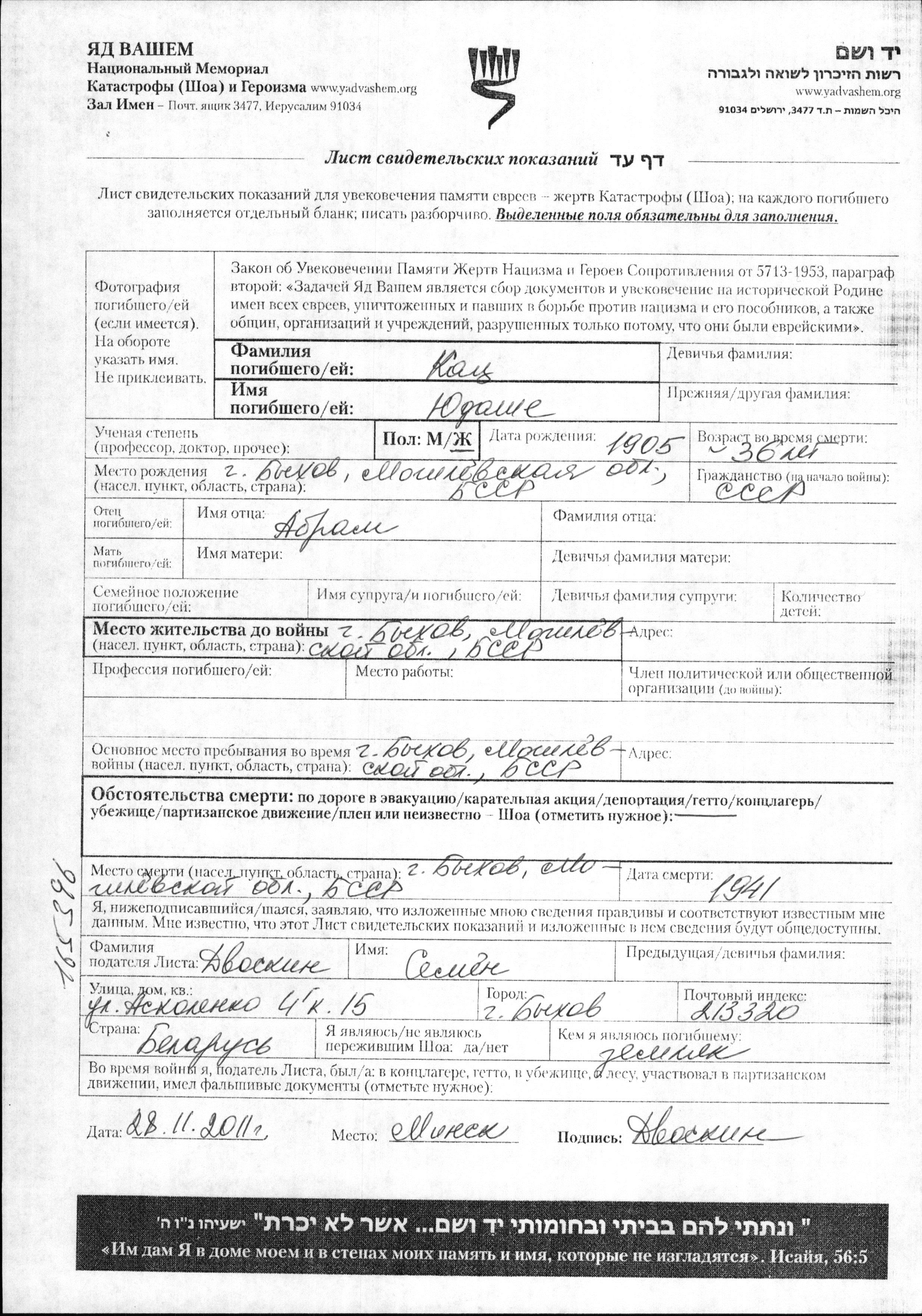 Кац Иегудит 1905 Быхов, Белоруссия (СССР) Лист свидетельских показаний