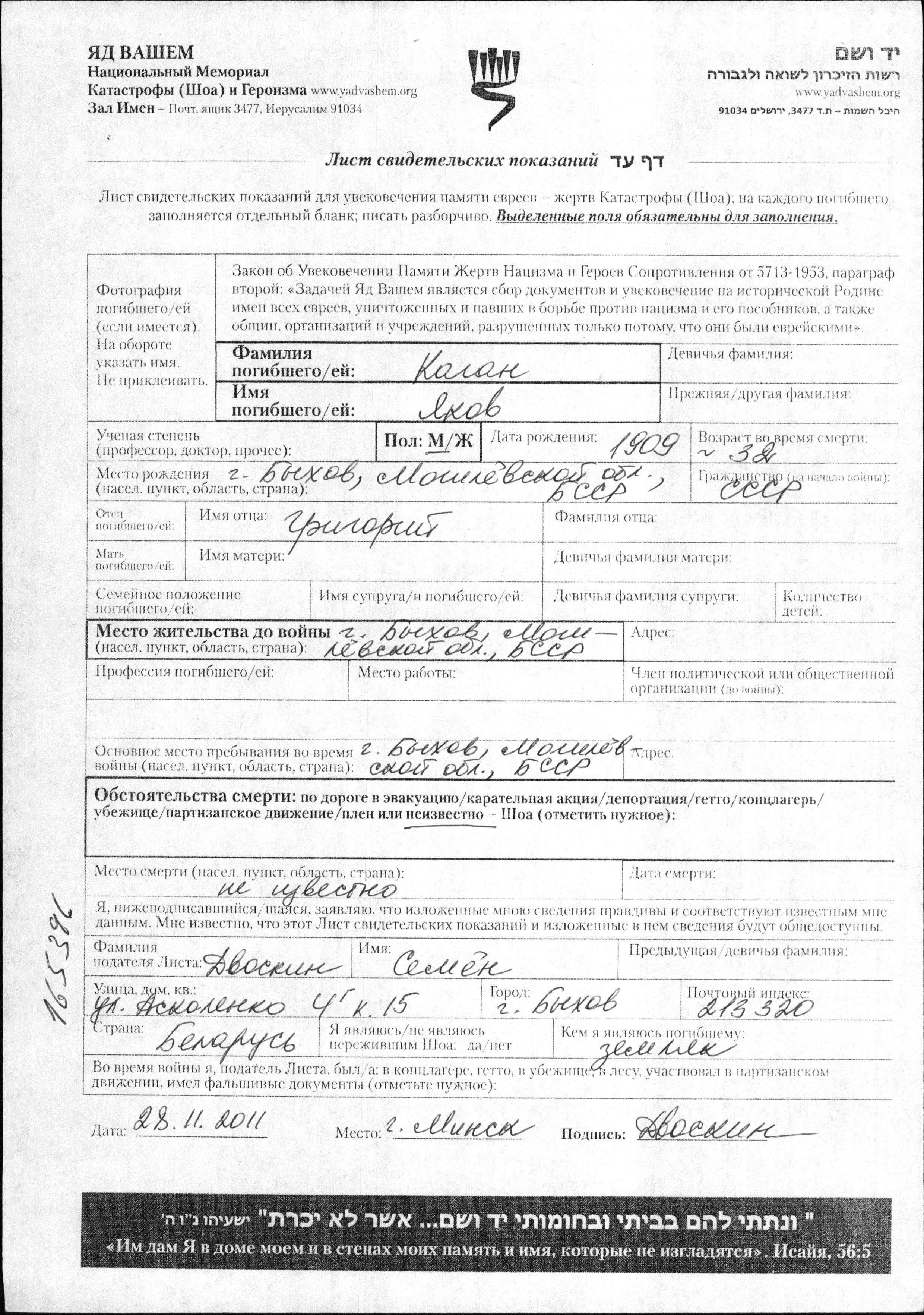 Каган Яков 1909 Быхов, Белоруссия (СССР) Лист свидетельских показаний