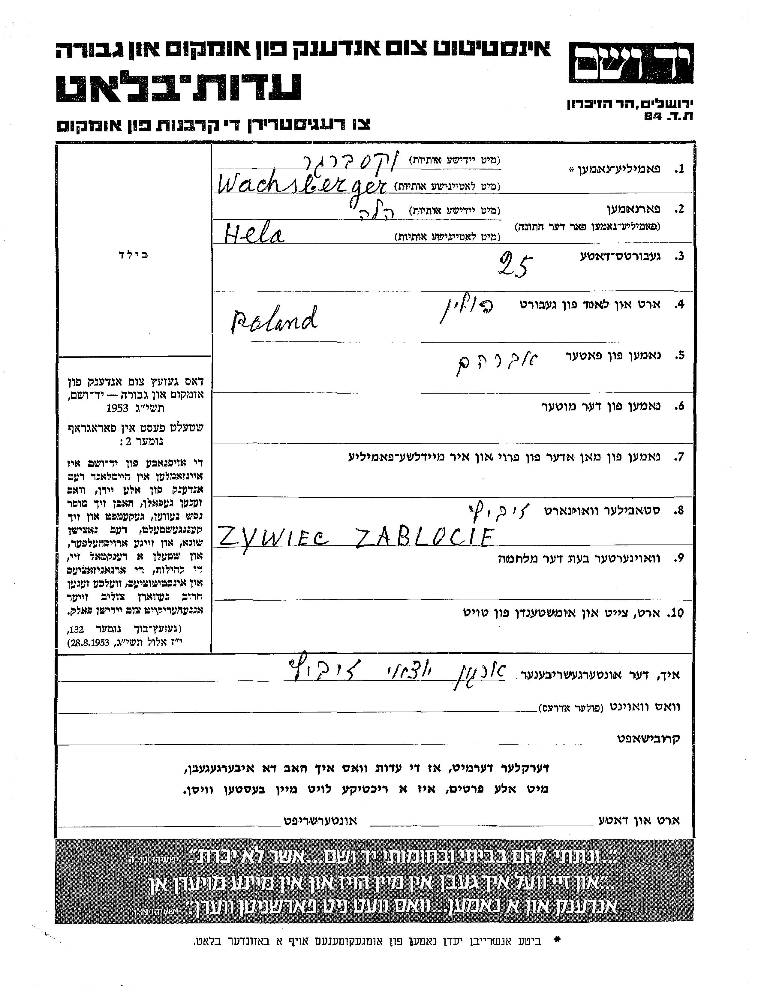 Хела Вахсбергер, место рождения: Польша. Отец: Авраам. Место жительства до войны: Живец, Польша.