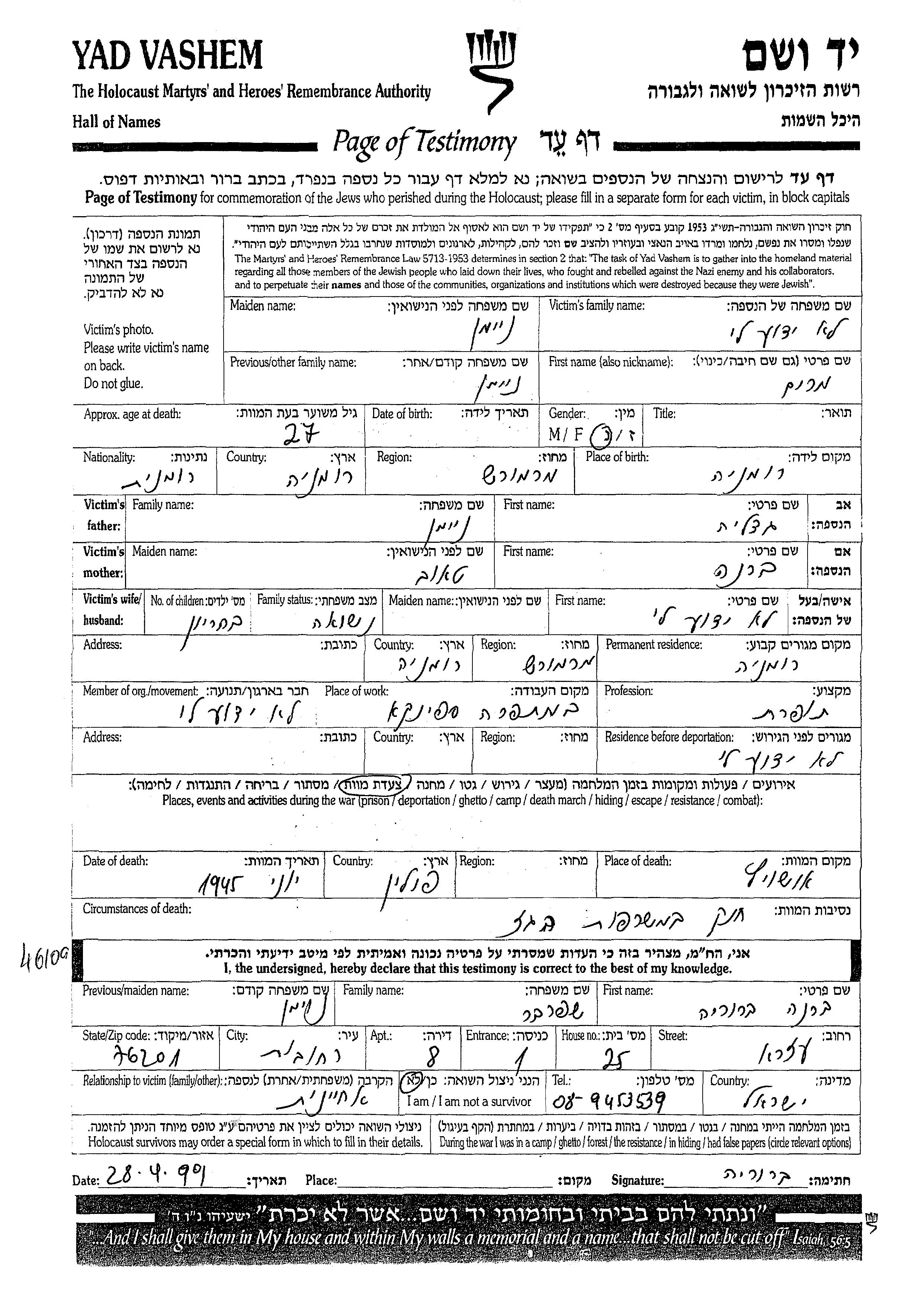 Фамилия неизвестна Мирьям Румыния Лист свидетельских показаний