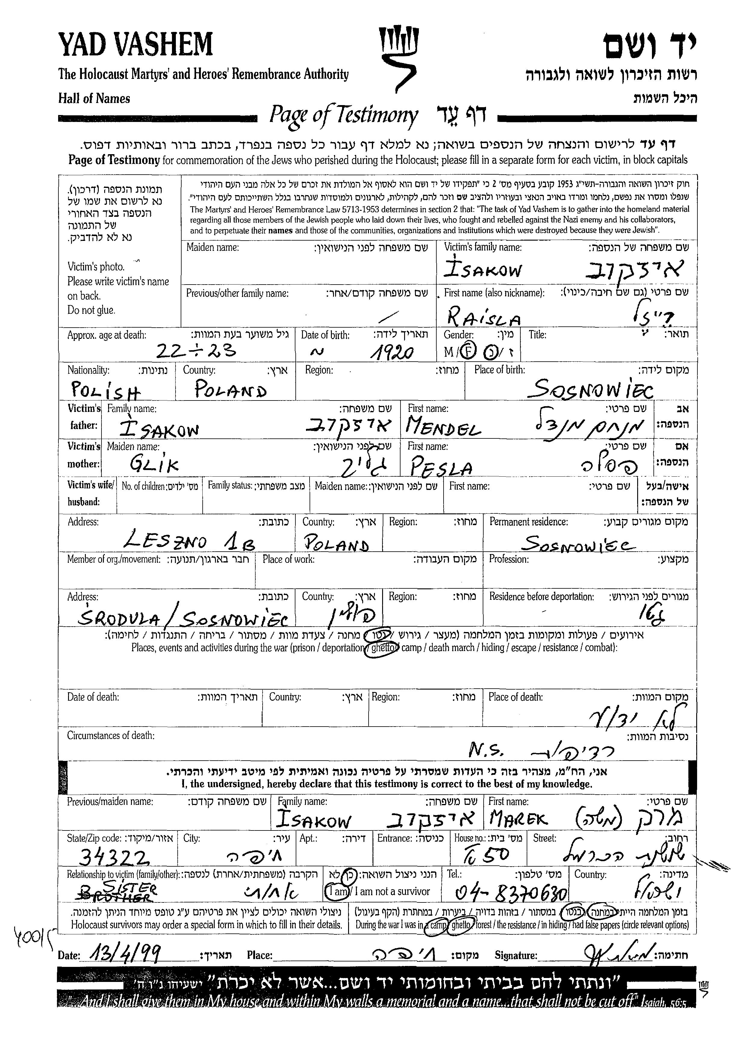 Райсла Рейзл Изаков, место рождения: Сосновец, Польша. Отец: Мендель Менахем, mать:Песла. Место жительства до войны: Сосновец, Польша. Место во время войны: Сродуля, Польша.