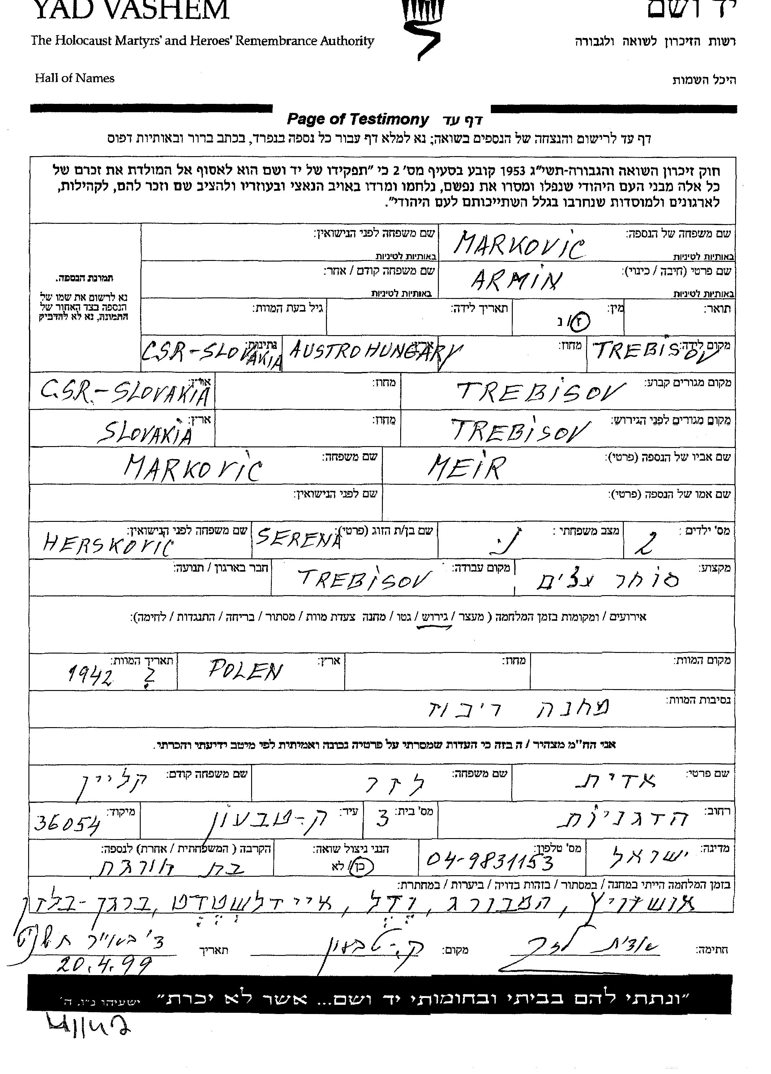 Армин Марковиц, место рождения: Требишов, Чехословакия. Отец: Меир. Лесоторговец. Женат / замужем. Место жительства до войны: Требишов, Чехословакия. Место во время войны: Требишов, Чехословакия.