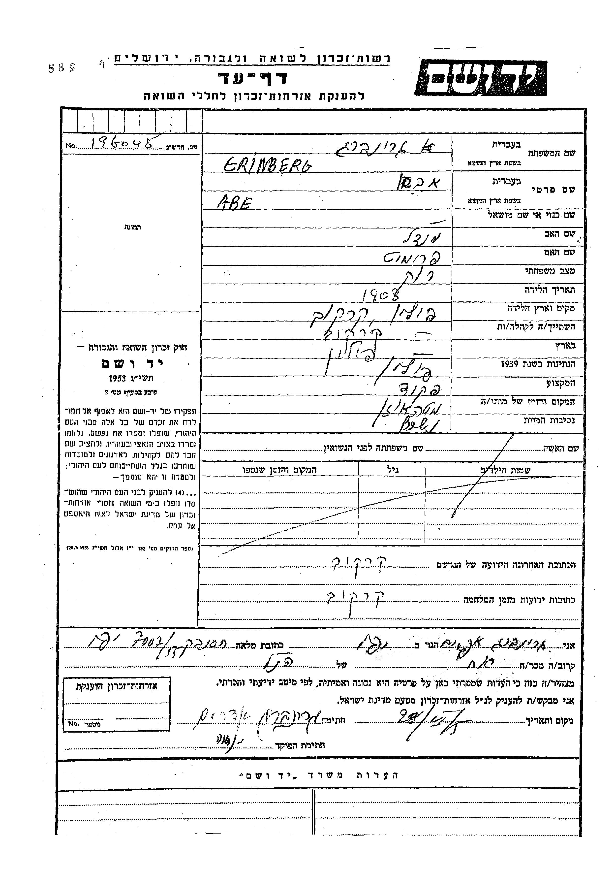 Абе Гринберг, место рождения: Краков, Польша. Отец: Мендель, mать:Фримит. Клерк. Холост / не замужем. Место жительства до войны: Краков, Польша. Место во время войны: Краков, Польша.