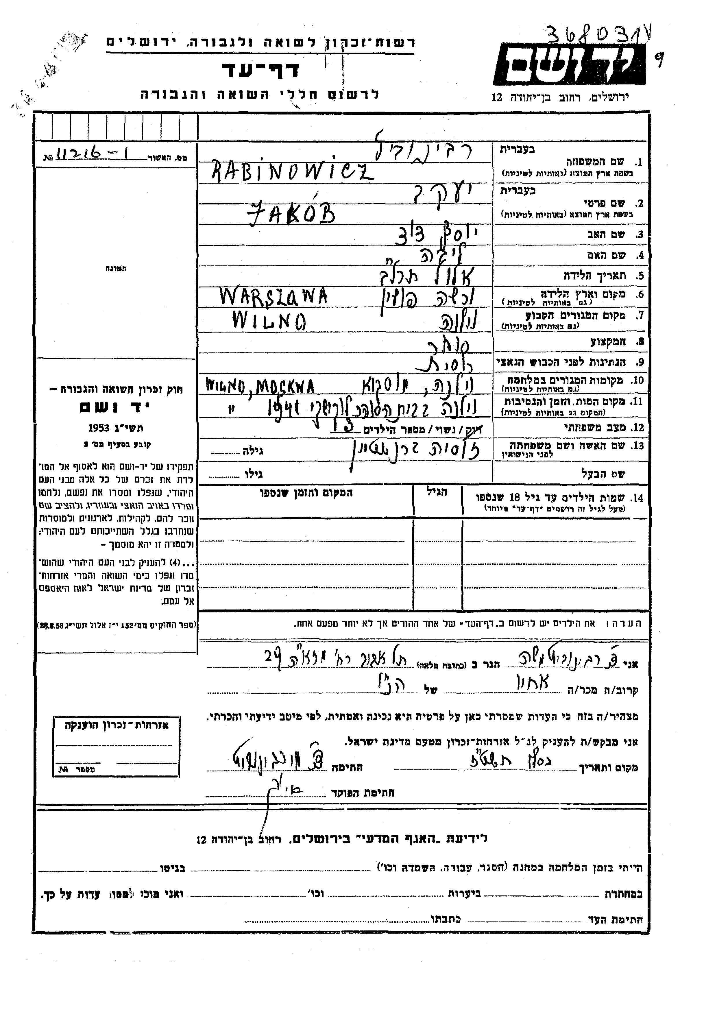 Якоб Рабинович, место рождения: Варшава, Польша. Отец: Иосеф Давид, mать:Либа. Торговец / торговка. Женат / замужем. Место жительства до войны: Вильно, Польша. Место во время войны: Москва, Россия (СССР).