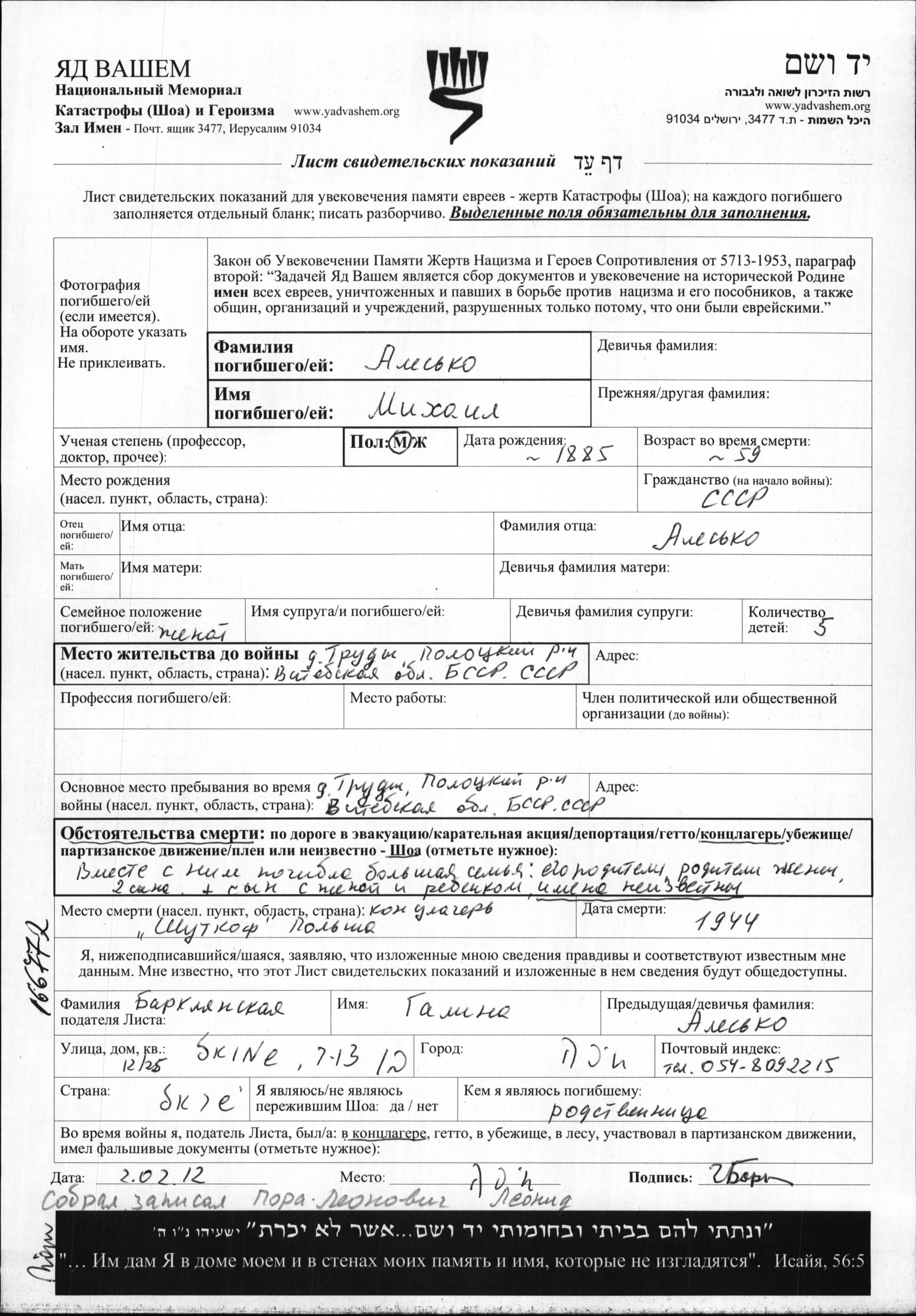 Яд Вашем - Листы свидетельских показаний Мемориального фонда