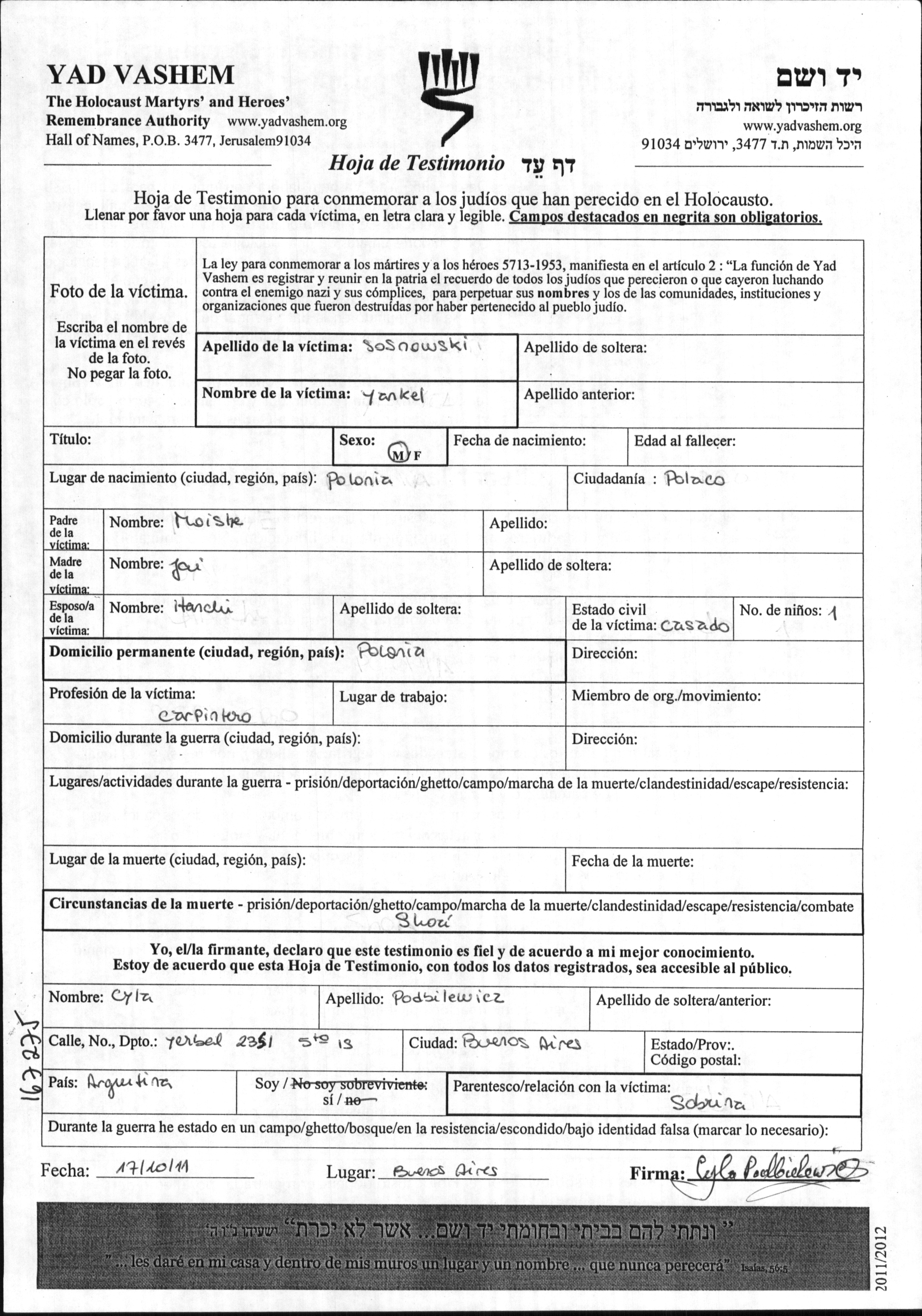 Янкель Сосновски, место рождения: Польша. Отец: Мойше, mать:Хай. Carpinteiro. Женат / замужем. Место жительства до войны: Польша.