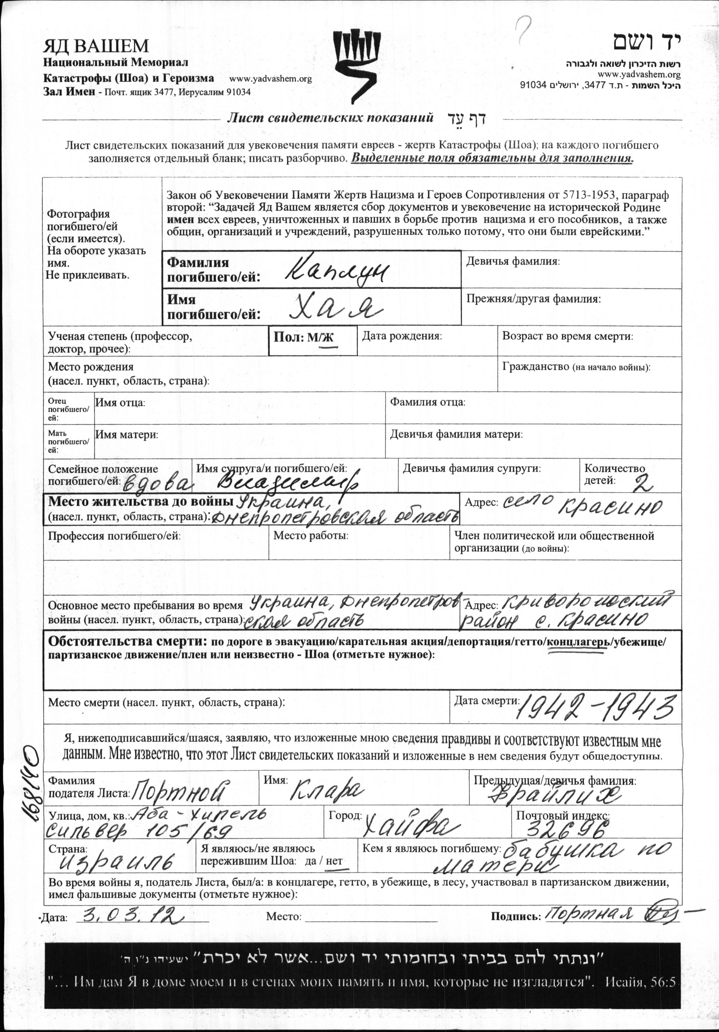 Каплун Хая Красино, Украина (СССР) Лист свидетельских показаний