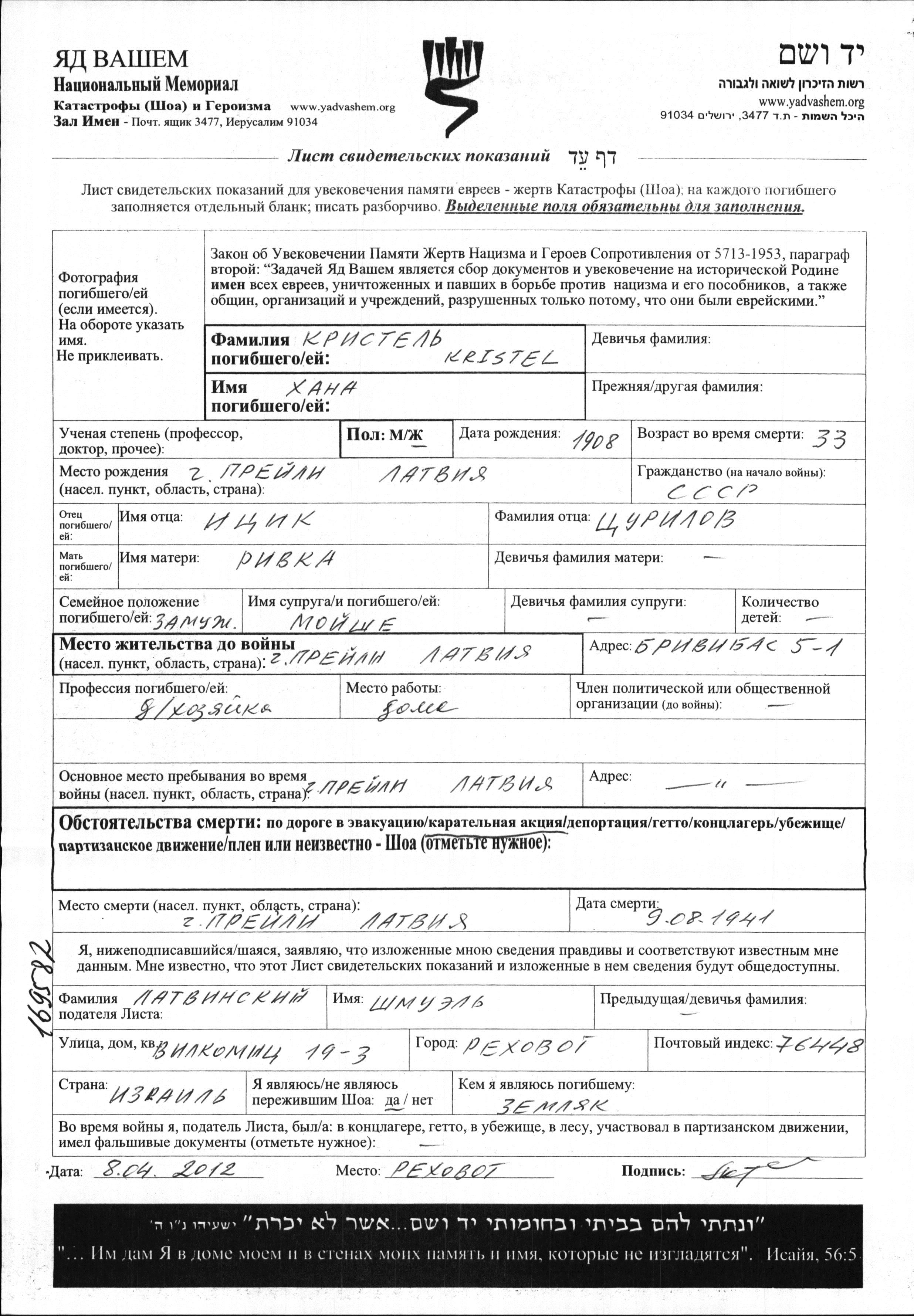 Хана Кристель, девичья фамилия Цурилов, место рождения: Прейли, Латвия. Отец: Ицик, mать:Ривка. Домохозяйка. Женат / замужем. Место жительства до войны: Прейли, Латвия. Место во время войны: Прейли, Латвия. Хана уничтоженa в период Шоа. место смерти: Прейли, Латвия в 09/08/1941.