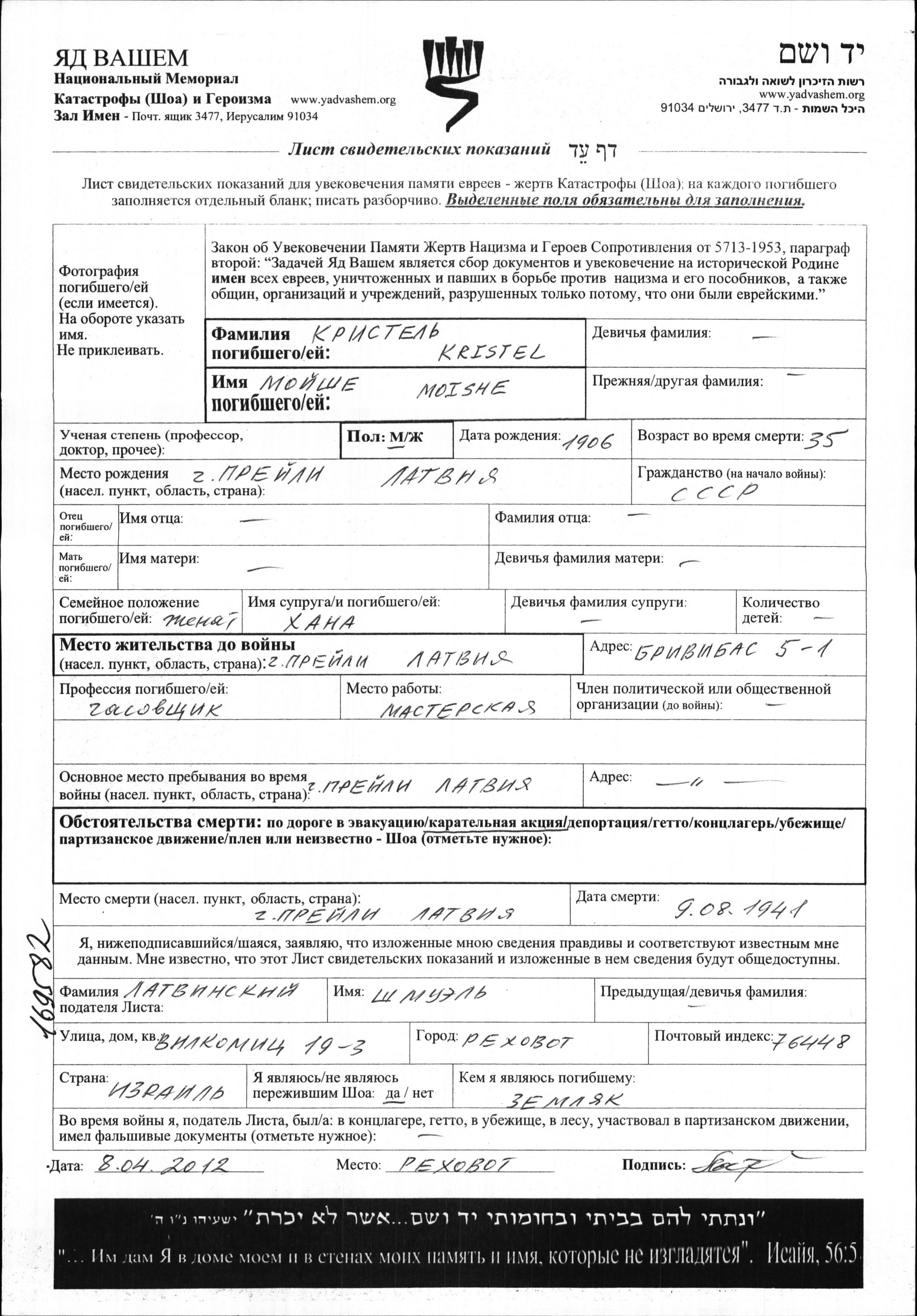 Мойше Кристель, место рождения: Прейли, Латвия. Часовщик. Женат / замужем. Место жительства до войны: Прейли, Латвия. Место во время войны: Прейли, Латвия. Мойше уничтожен в период Шоа. место смерти: Прейли, Латвия в 09/08/1941.