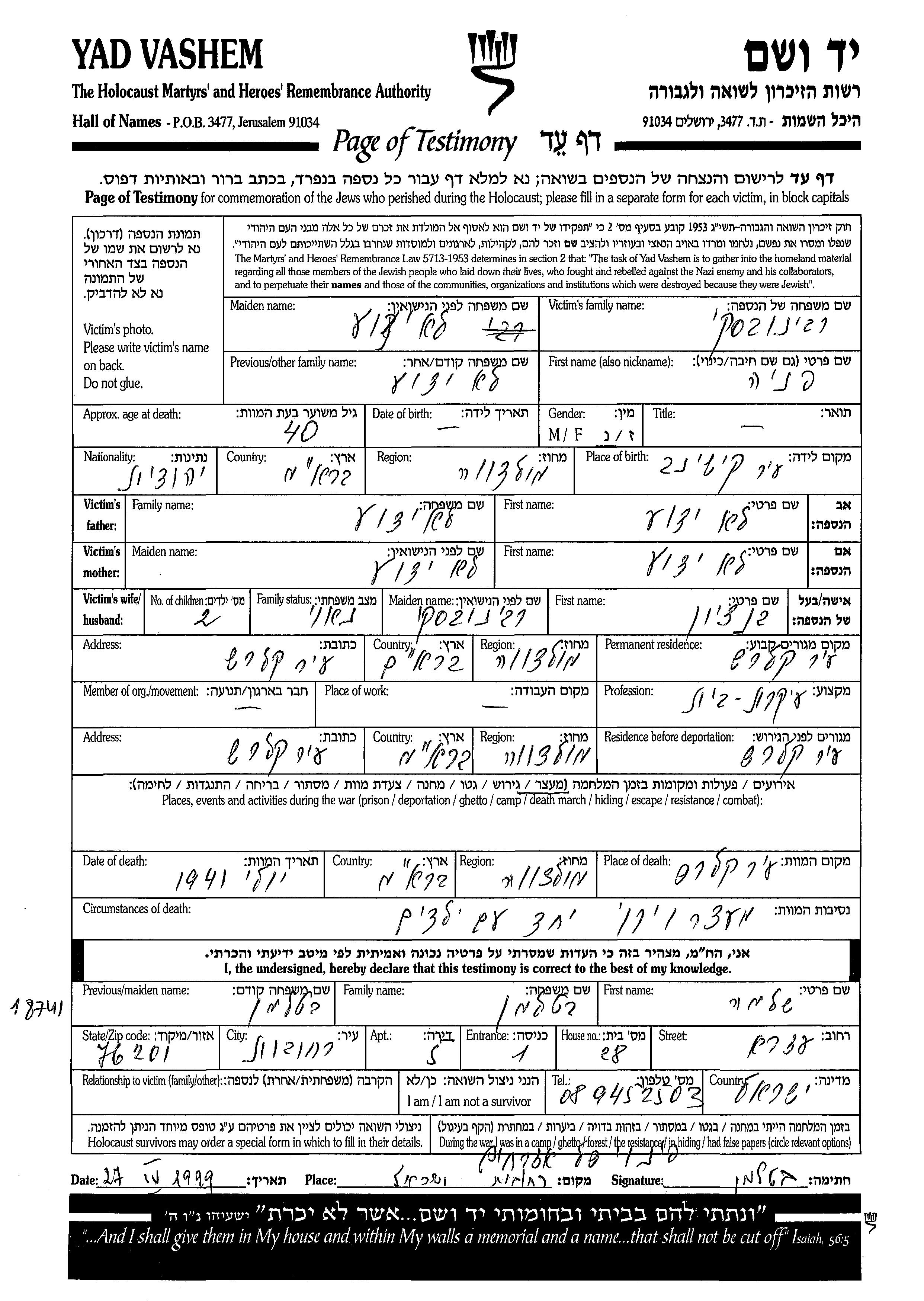 Яд Вашем - Листы свидетельских показаний Мемориального фонда