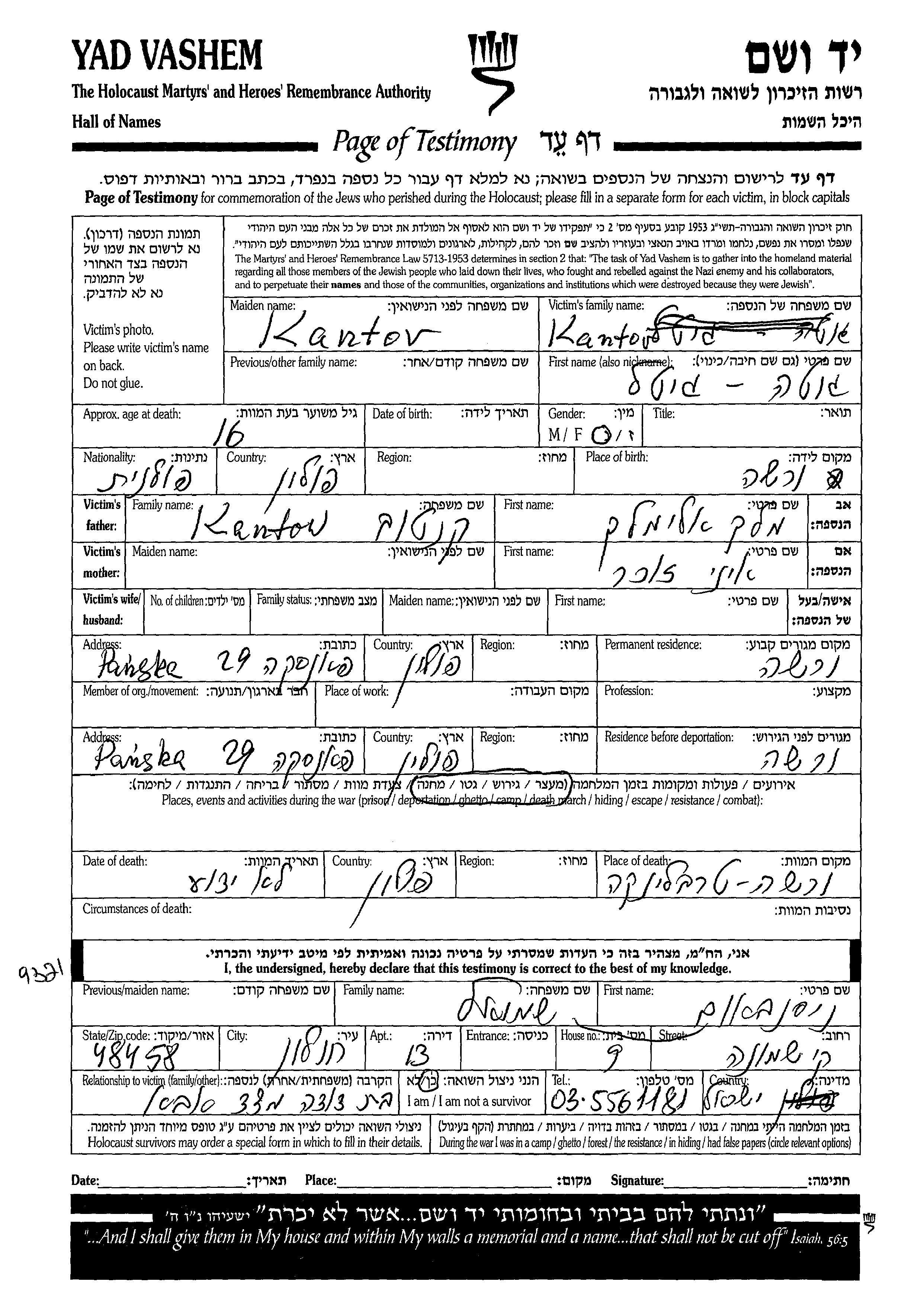 Гута Кантов, место рождения: Варшава, Польша. Отец: Мелех Элимелех. Место жительства до войны: Варшава, Польша. Место во время войны: Варшава, Польша.